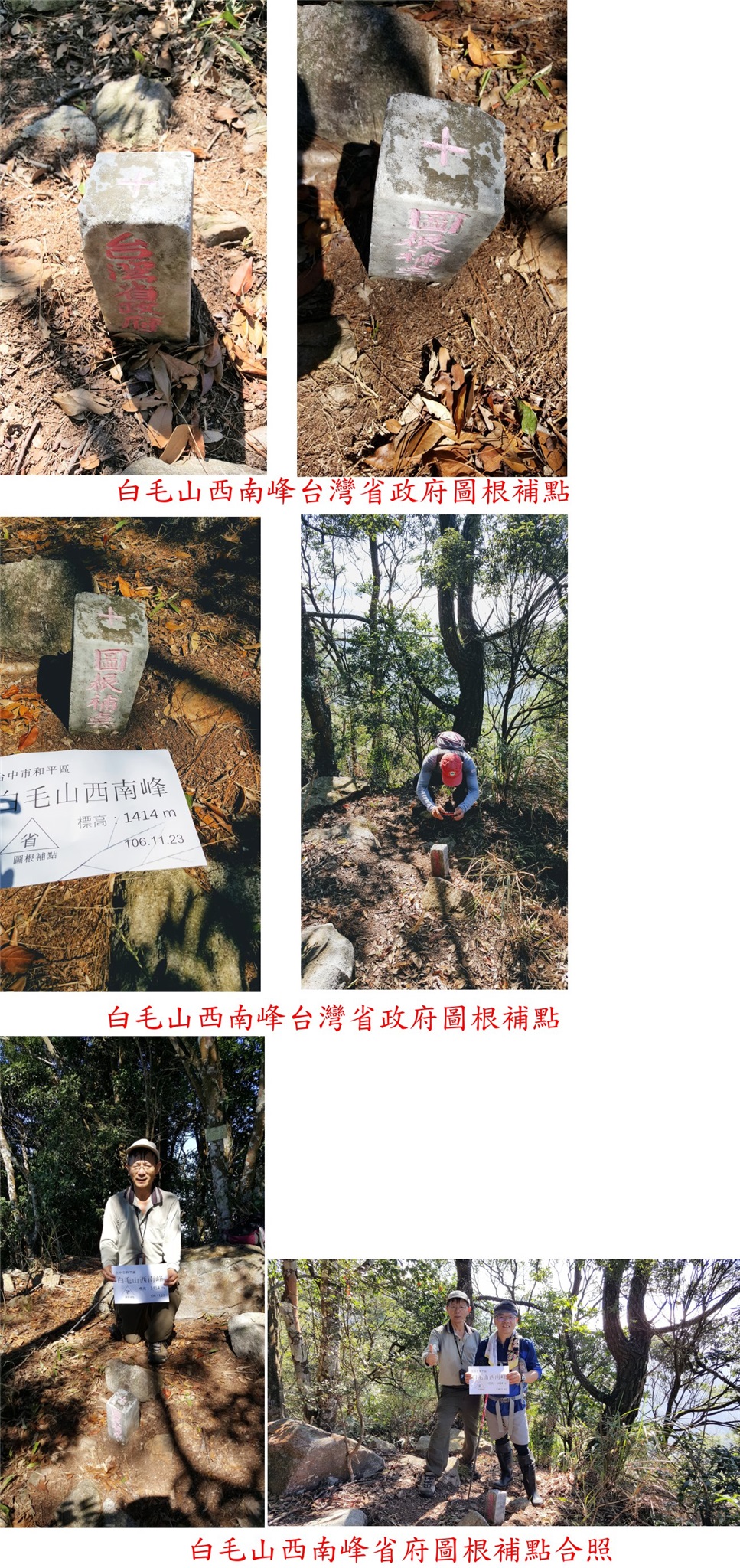 1、白毛山西南峰:位於台中市和平區,標高1414公尺,台灣省政府圖根補點;座標240232 2672141。