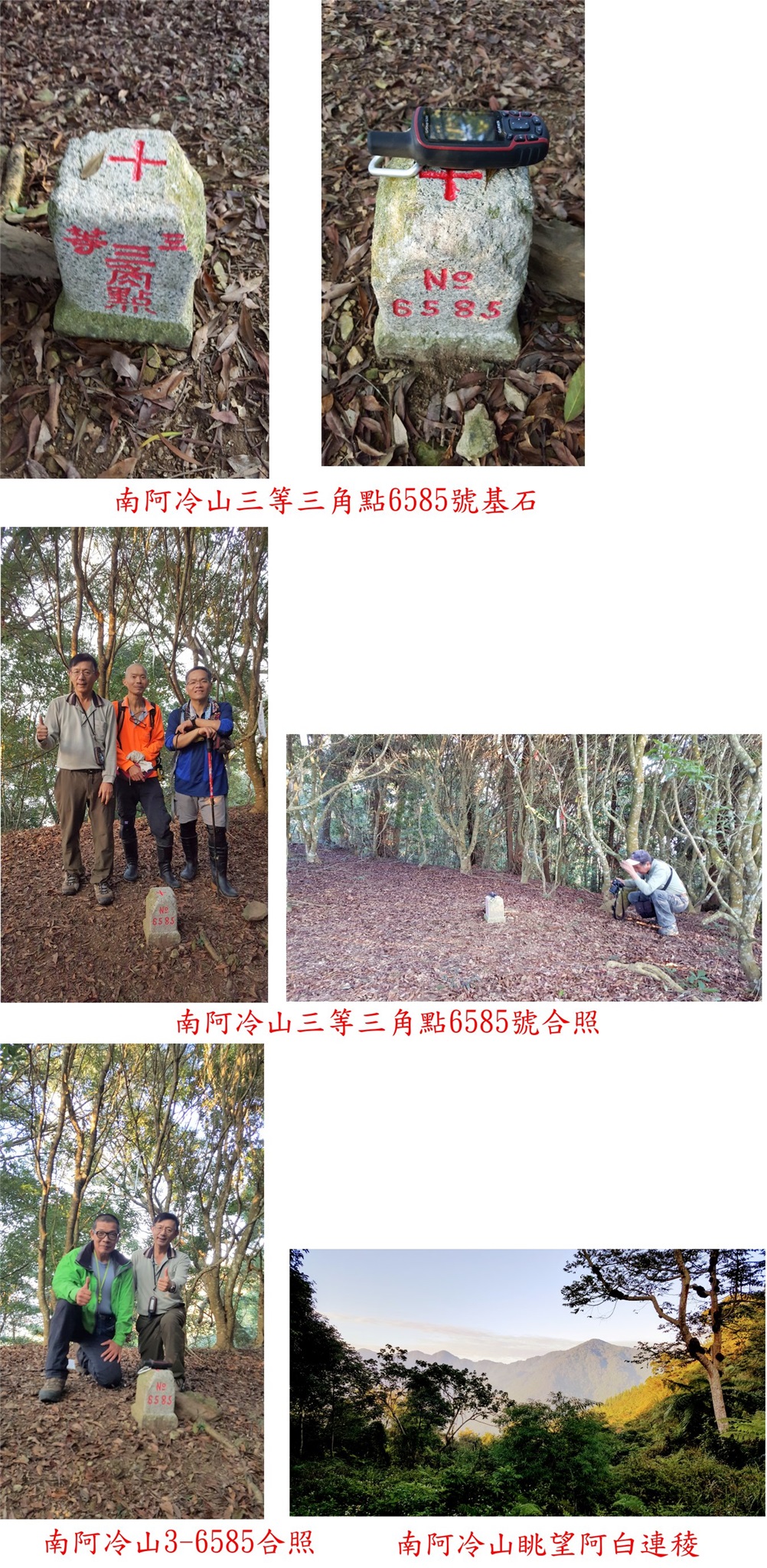 11/23本約好山友去戰柑子頭山、但因天候欠佳取消,臨時決定轉戰台中地區白毛等山;此行走白毛林道路線上登,先走路況佳的廢林道登上白毛山西南峰省府圖根補點,再來走白毛山3-6408,此山早年曾來過;第3座為連稜的次郎山省府圖根補點,此山與白毛山中間隔著一個大鞍部,陡降再陡上頗費力氣,今天走的2顆省府補點都是少見的大理石材質;連走白毛等三座山往返費時5.5小時(含休息吃飯),今日天氣晴朗、視野超好,再加上涼爽走來非常舒適,很棒的一條路線;另曾老師、光頭與阿德等3人則連稜縱走阿白,途經阿冷山2-1546與東阿冷山森林點這二座山,我再開車至南阿冷山登山口接駁;途中陪校長等人去走長興林道旁烏來山3-6402與南阿冷山3-6585等二座山,至於東阿冷山森林點因時間不足放棄下回再戰,今日走了5座山,其中3座曾去過,算來只有2顆基石入帳,此行感謝山界幾位健腳級的山友來陪我走這幾座山。