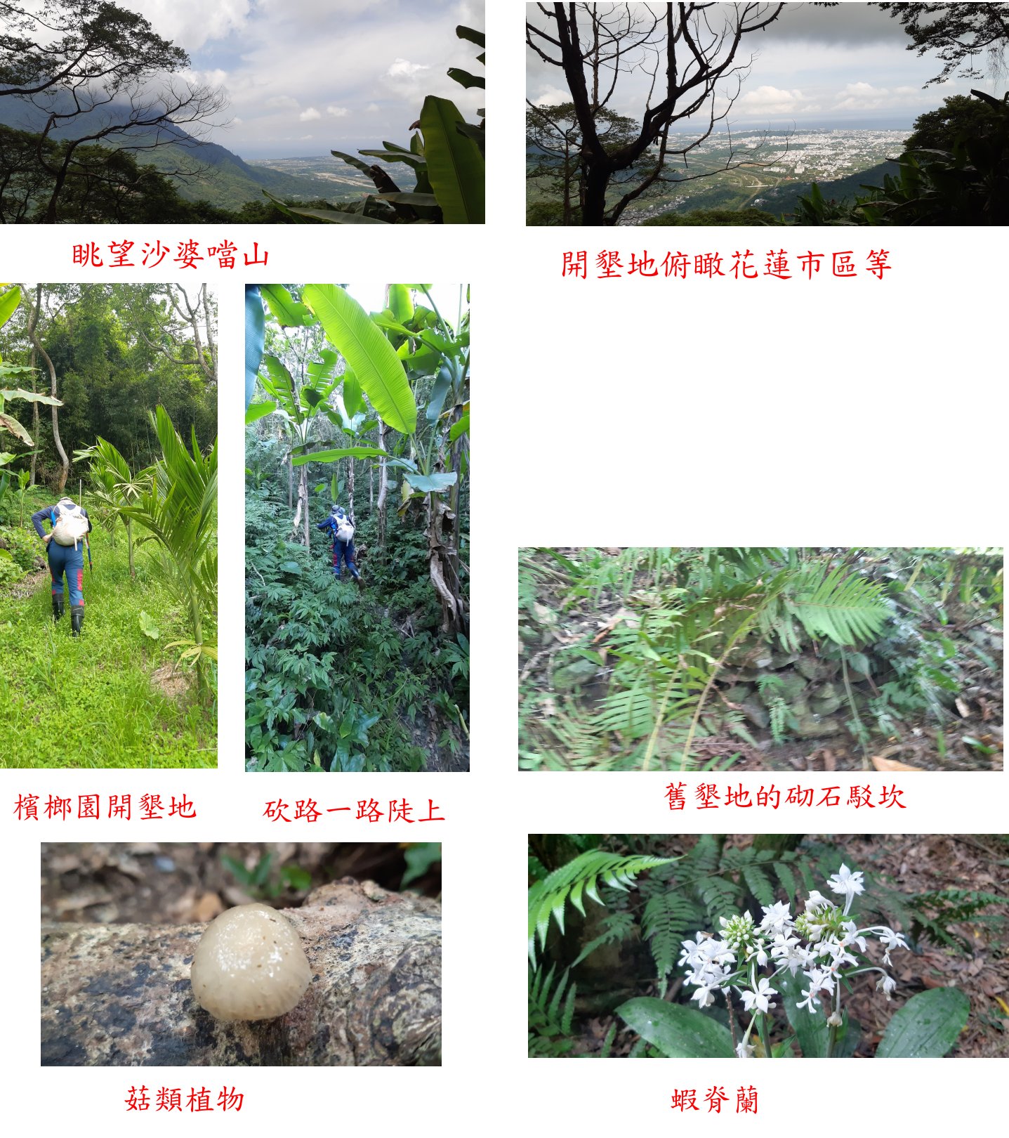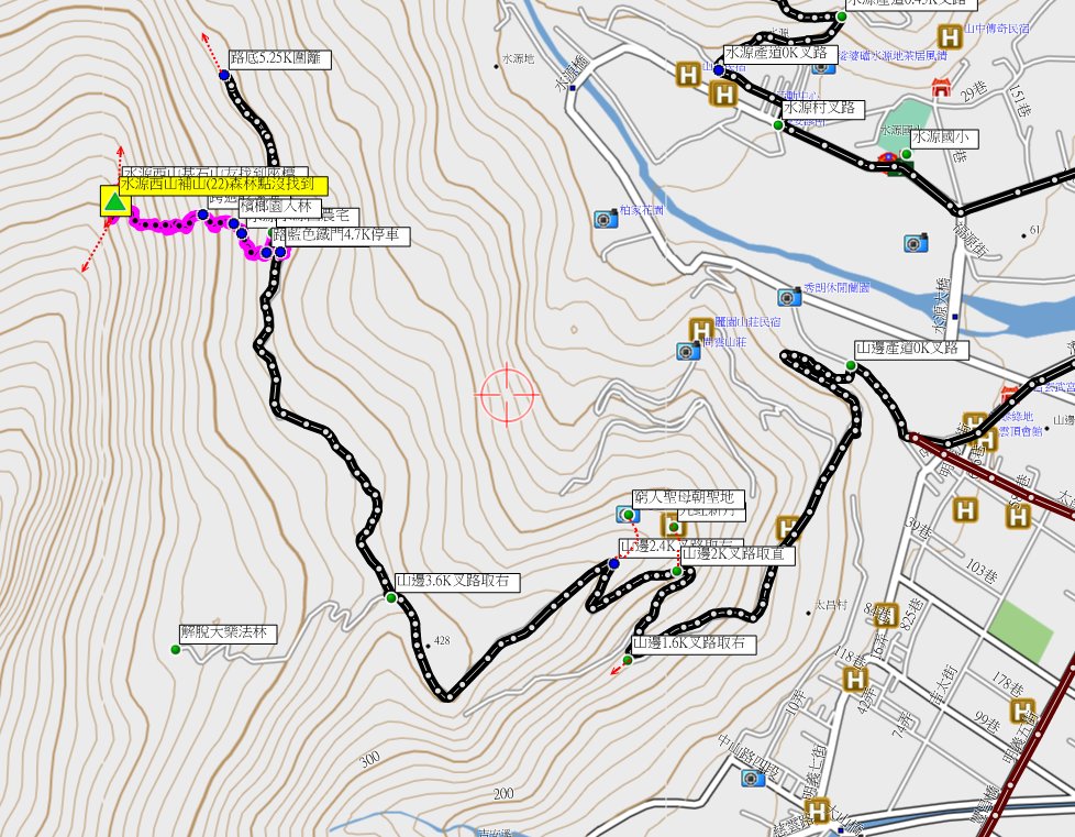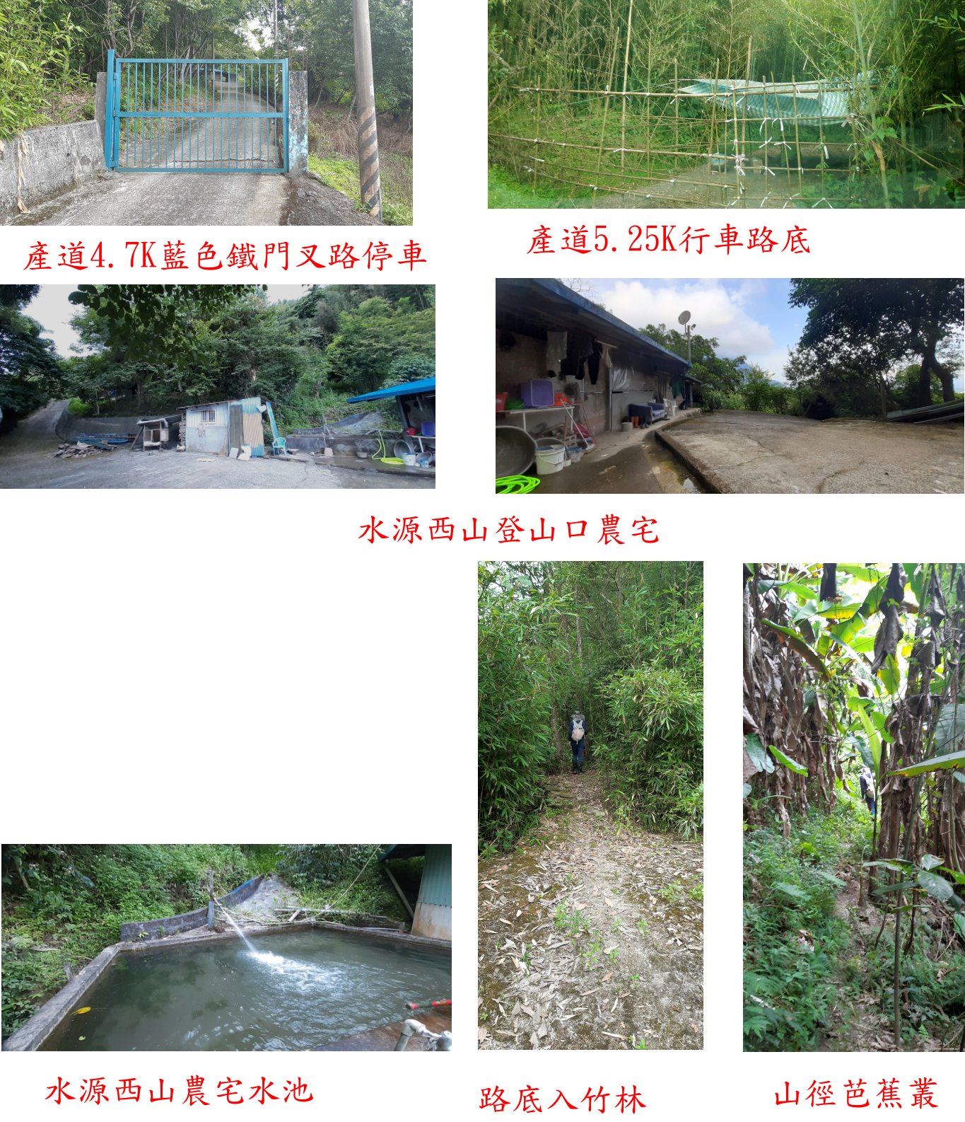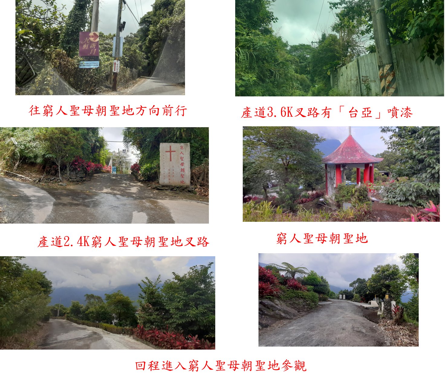 餐後由崇德走台9線往南走16.8K至北埔,右轉北埔路走0.6K,右轉花9線(民有街)走0.85K,續右轉花9線走2.8K;左轉花15線(中山路二段)過橋走0.5K,右轉慈濟路走2.8K,右轉明義六街走0.65K至掏園叉路【0K】,路口有九弘新月等民宿的指標;左轉水源村山邊產業道路上山走1.6K叉路,取右主線往窮人聖母朝聖地方向前行至2K叉路,右往九弘新月不取,取直至2.4K叉路,右往窮人聖母朝聖地不取;取左大迴轉至3.6K叉路,路口圍籬有「台亞」噴漆,電桿為「政華高支102」號;取右產道支線至4.7K藍色鐵門叉路停車,高