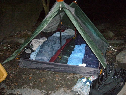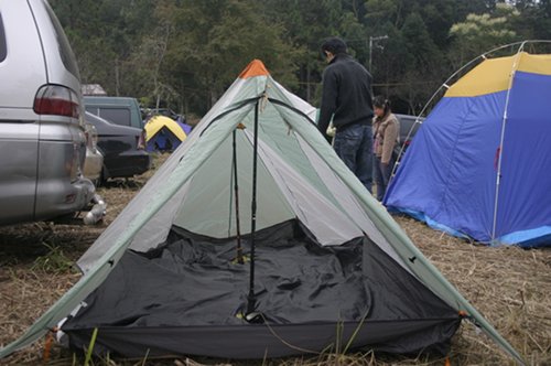 第二次使用是去嗄拉賀泡湯的時候,但這一次的營地比較差,營釘較難釘,所以沒搭的很好,且沒注意登山帳架設的高度(太高了),因此外帳比較沒貼近地面且沒撐緊,在外帳和地布之間會有一點風吹進來,因此下次架設時便要注意登山帳的高度