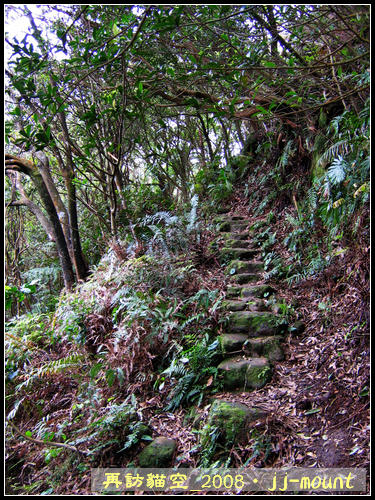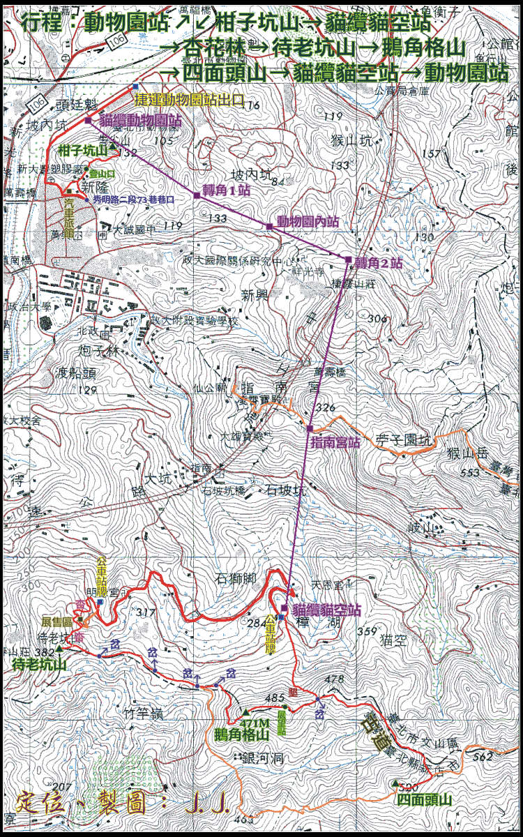 〈瑣記〉 07:06 出捷運動物園站 (約20M) 07:10 過貓纜動物園站 (約20M), 已經有人在排隊. 離集合時間還有一個多小時, 先去撿旁邊的柑子坑山. 07:20 秀明路二段73巷巷口 (約20M) 07:23 登山口 (約40M) 07:48-07:56 柑子坑山 (132M), 又名吿尖山. 08:10 回登山口 (約40M) 08:13 回秀明路 (約20M) 從秀明路二段73巷巷口進入, 來到車道盡頭的民宅旁便是登山口 (無路條), 起爬不久後遇岔路須取右, 鑽過鐵絲網, 大致沿著淺谷中的墾地到小鞍 (約75M) 再左折入林...... 最後在柑子坑山東南稜進入相思樹林 (約100M, 路條出現), 再陡爬登頂. 柑子坑山的山頂離貓纜的纜車線很近, 彷彿一躍可至. 另有一圖根點埋在過膝的蕨草中, 北向視野尚可, 回程則抄捷徑由一汽車旅館的西側接回秀明路, 可省約 150m 的路程. 08:24-09:04 貓纜動物園站排隊 (約20M), 等了約 40min, 尚可接受. 09:26 抵貓纜貓空站 (約300M), 出站後到公車站牌搭貓空遊園公車往杏花林. 09:46 公車杏花林站 (約280M) 之後就是杏花林的閒晃, 主要是在B區取景照相, 然後經展售區、A區、到待老坑山東稜. 雖然杏花正逢盛開, 但畢竟花季遲到太久, 綠葉早已迫不及待地冒出, 會在大範圍的畫面中裡佔去不少顏色. 10:44 待老坑山東側岔路口接稜上步道 (約360M). 10:47-10:51 待老坑山 (382M). 有三等三角點編號一○九五号, 雜林中無展望. 10:54 回待老坑山東側岔路口 (約360M), 之後沿稜東行. 11:24 鵝角格山登山口 (約360M), 續行是北側山腰路往貓纜站, 取右上登稜. 11:43-11:55 鵝角格山 471M, 方才的陡升結束後即山頂基點處, 西北方視野很好. 12:07 展望點 (約475M). 展望點在鵝角格山基點東側約 250m 處, 即山頭最高處(485M)再略東的地方. 可說是俯看貓空纜車的最佳地點, 居高臨下, 從貓纜的貓空站看到指南宮站角度甚好; 從展望點再略往東, 亦可見到二格山、貓空尖山等的峻帥山容. 12:19-12:21 鵝角格山東鞍接古道 (約450M), 之後沿古道往四面頭山. 東鞍這邊是個十字路口, 西向是從鵝角格山過來的稜線, 南向可下往溪谷, 由東邊過來並轉往北下的, 則是條至少有百年歷史的古道. 由百年前出版的《台灣堡圖》可看到, 在今日北宜公路十六份坑的地方, 有條穿過四面頭德高嶺山區下往景尾(景美)再通台北城的古道, 路線大致經過四面頭山東側, 鵝角格山的東、北側, 以及待老坑山的東、南側. 不過古道在待老坑山東側的部份, 因後來的道路舖設已經看不出來, 這次則經由四面頭山東側到鵝角格山東側的部份, 行來起伏不大, 寬適愉快. 12:46 四面頭山東側岔路口 (約490M), 古道續往左(東), 取右(西)上而行. 12:53-13:03 四面頭山 (520M), 有圖根點, 密竹林中無展望. 13:10 回四面頭山東側岔路口 (約490M). 13:36-13:48 回鵝角格山東鞍 (約450M), 休息後沿古道續北下. 13:56 墾地(有圍籬)(約390M). 古道本來應該在這一帶續西, 但未細探, 沿著現成的山路繼續北下. 過墾地之後路變寬且遊客漸多, 被問路N次 (往上到那?) , 回答不易. ^^ 14:08 接公路 (約300M), 就在貓纜貓空站南邊. 之後就是午餐、排隊、貓纜, 最後在動物園站解散. :)
