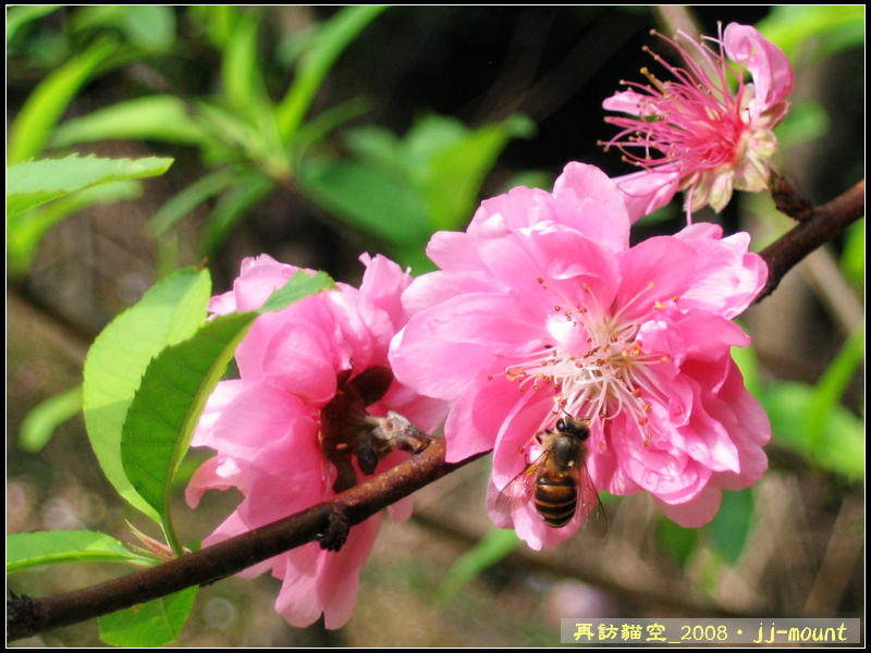 杏花林裡的盛放. 可惜因花季來得太晚, 綠葉已經冒出很多.