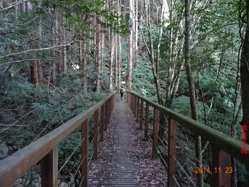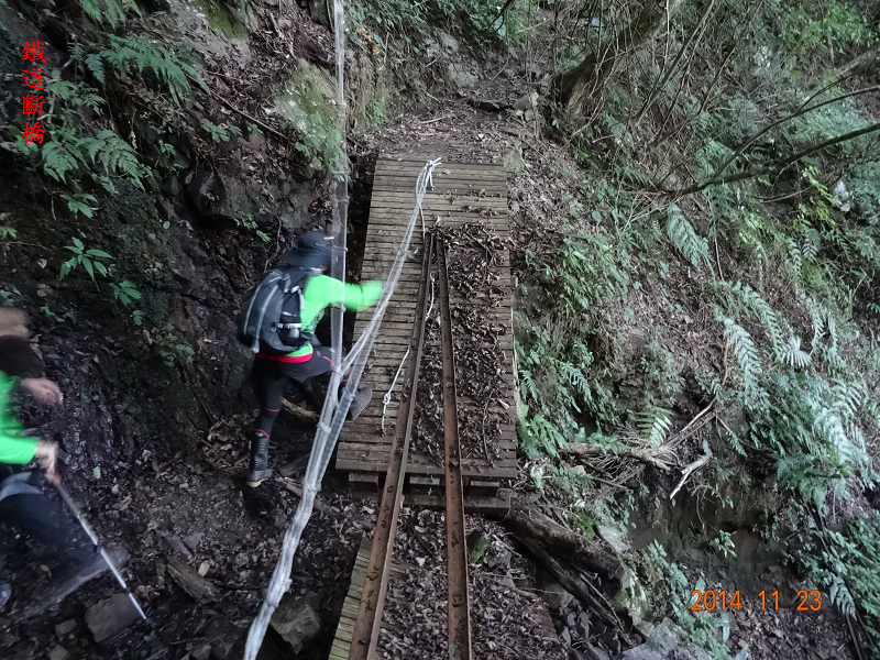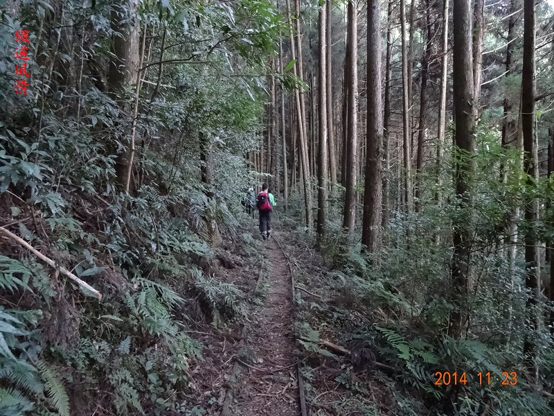 上「加里山」在下至9號樁取左岔往大坪林道,下至廢棄台車鐵軌
