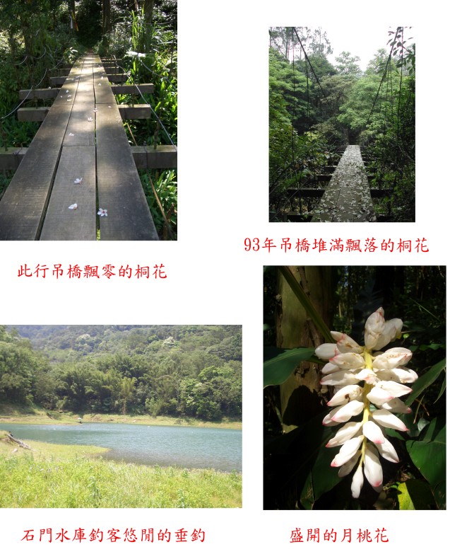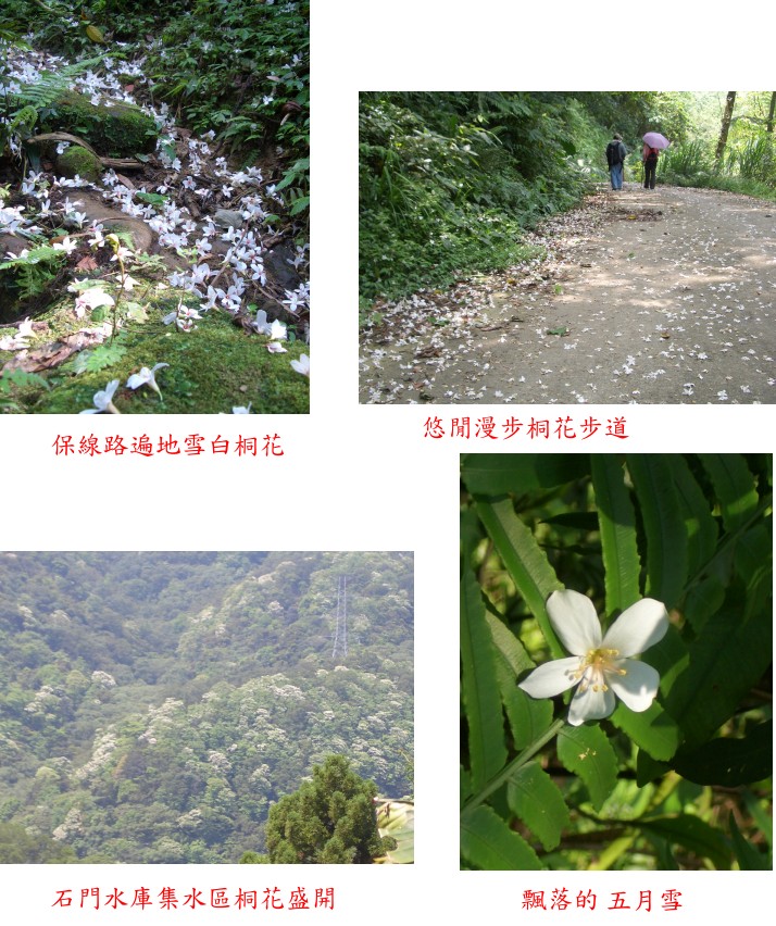 邀請幾位同事到石門水庫集水區的山區,悠遊漫步山林,欣賞美麗的桐花。此行由舊時的「童話世界」,沿著鮮為人知的步道,經過吊橋,滿山雪白的桐花,登上蓬萊仙島山折回,沿途有水庫淹沒區的廢棄村落,俯瞰水庫,全程不到三小時,來一趟花之饗宴。