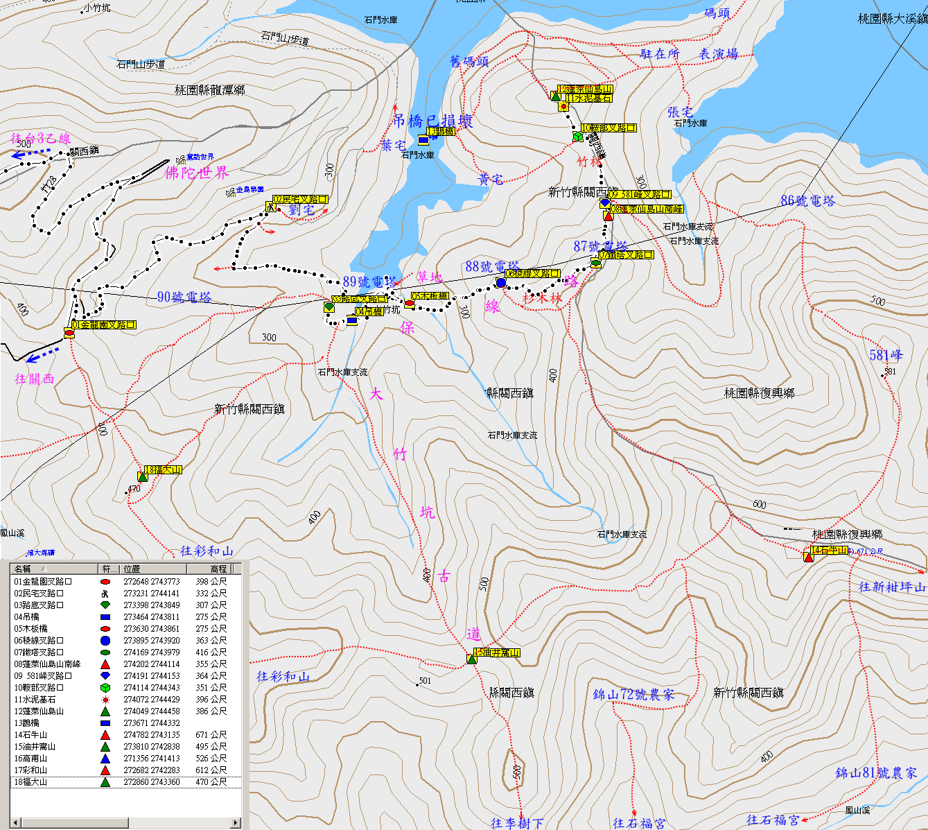 10:38蓬萊仙島山,標高386公尺,石門三角點,旁有兩顆水泥柱,右側有山徑通往水庫碼頭、舊時表演場、駐在所等地;左側山徑可下至湖畔,繞一圈可接10:28的鞍部叉路口。山頂位於竹林間,北面俯瞰石門水庫大壩、後池與大溪市集等。