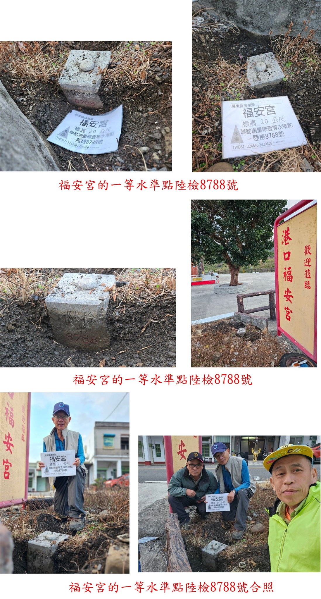 於路右『港口福安宮』招牌下方,見到福安宮的陸檢8788號,基石埋土與地平只能見到頂端,要拍號碼要挖,聯勤測量隊應立於民國86年8月;此點係幾年前阿明教授等山友找到的,後見到山友紀錄此點被廟前水泥地覆蓋一直沒來,最近看到山友照片此點尚在來補。