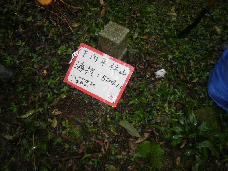 10:41 續行,抵下內平林山,土地調查局圖根點海拔504M。附地寬廣,全體合照。山友雲行要另行踏查別處在此告辭,折返回東步道。