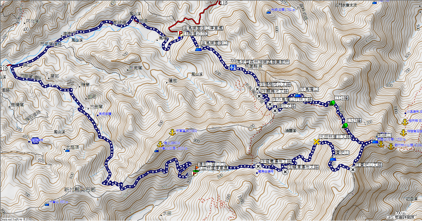 外鳥嘴山:又名關西鳥嘴山,位於桃園縣復興鄉、新竹縣尖石鄉交界處,海拔1350公尺,無基石。