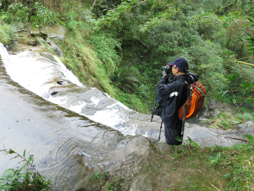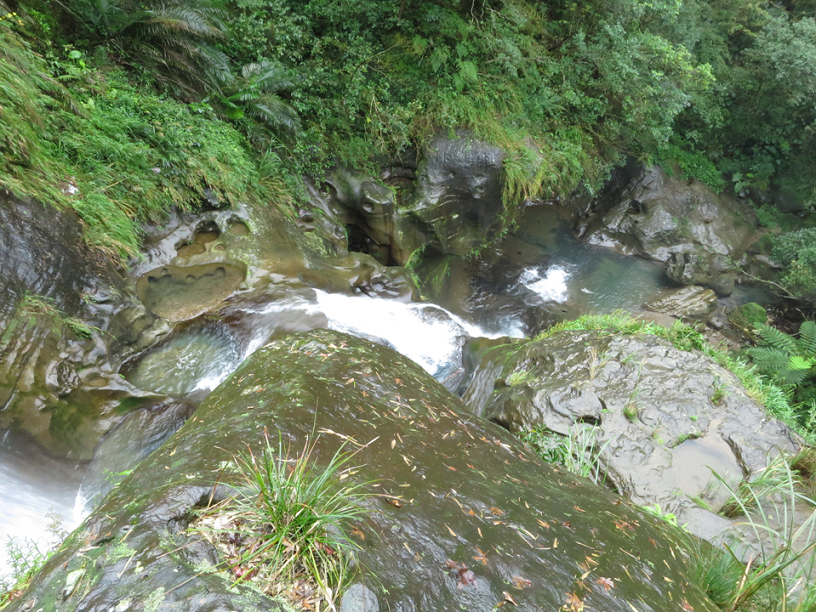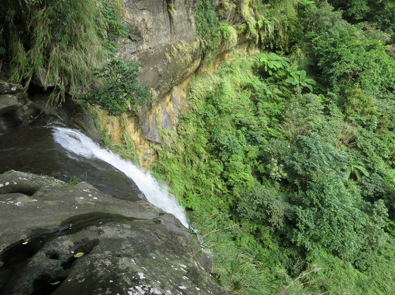 圖14:垂繩2.5公尺,踏上瀑頂下方的這塊巨石,俯拍瀑底。