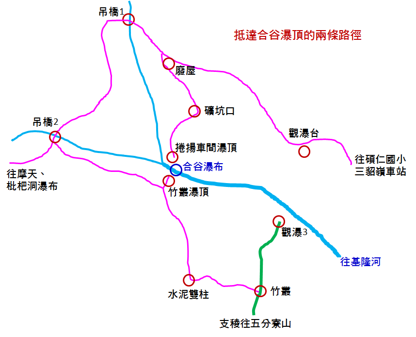 五分寮山~合谷瀑布,前段循主稜往下,後段循支稜下抵合谷瀑頂。