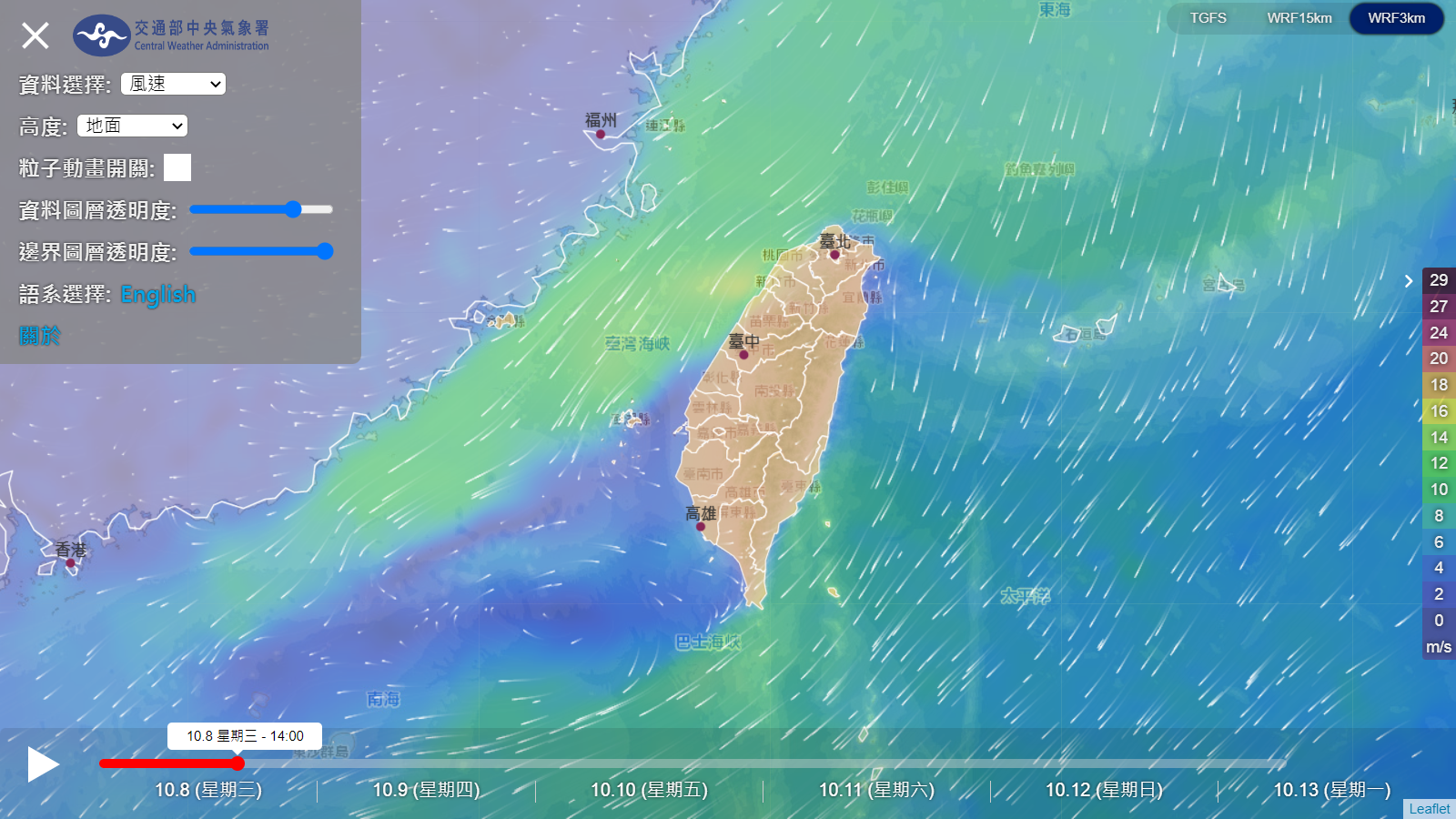 近日東北風南下出現些微降溫,終於等到秋天的訊息,若想體會更明顯的秋天天氣,就等到下周末(10/18-19)吧,對於登山者來說,更需要留意的是風速與降雨的影響,從風場模擬網站可以清楚看到台灣海峽北部海面與沿海風速都超過五級,陣風也超出七級,高山與沿海的氣象站觀測風速也出現相似的大風趨勢,因此行走在裸露稜線的登山行程需要留意當天風速預報,東北角區域的縱走路線也一樣受到影響。