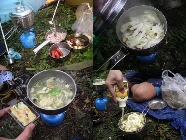 處的一灘水,於是跑到雙人帳的延伸帳內炊事,煮麵並煎