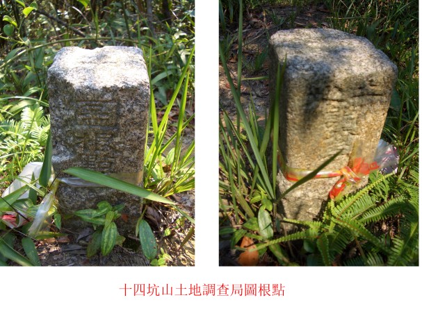 1、十四坑山-又稱金顏山,位於基隆市轄區、鄰近汐止交界處,標高357公尺,有一顆土地調查局圖根點,GPS(314350 2779653)。
