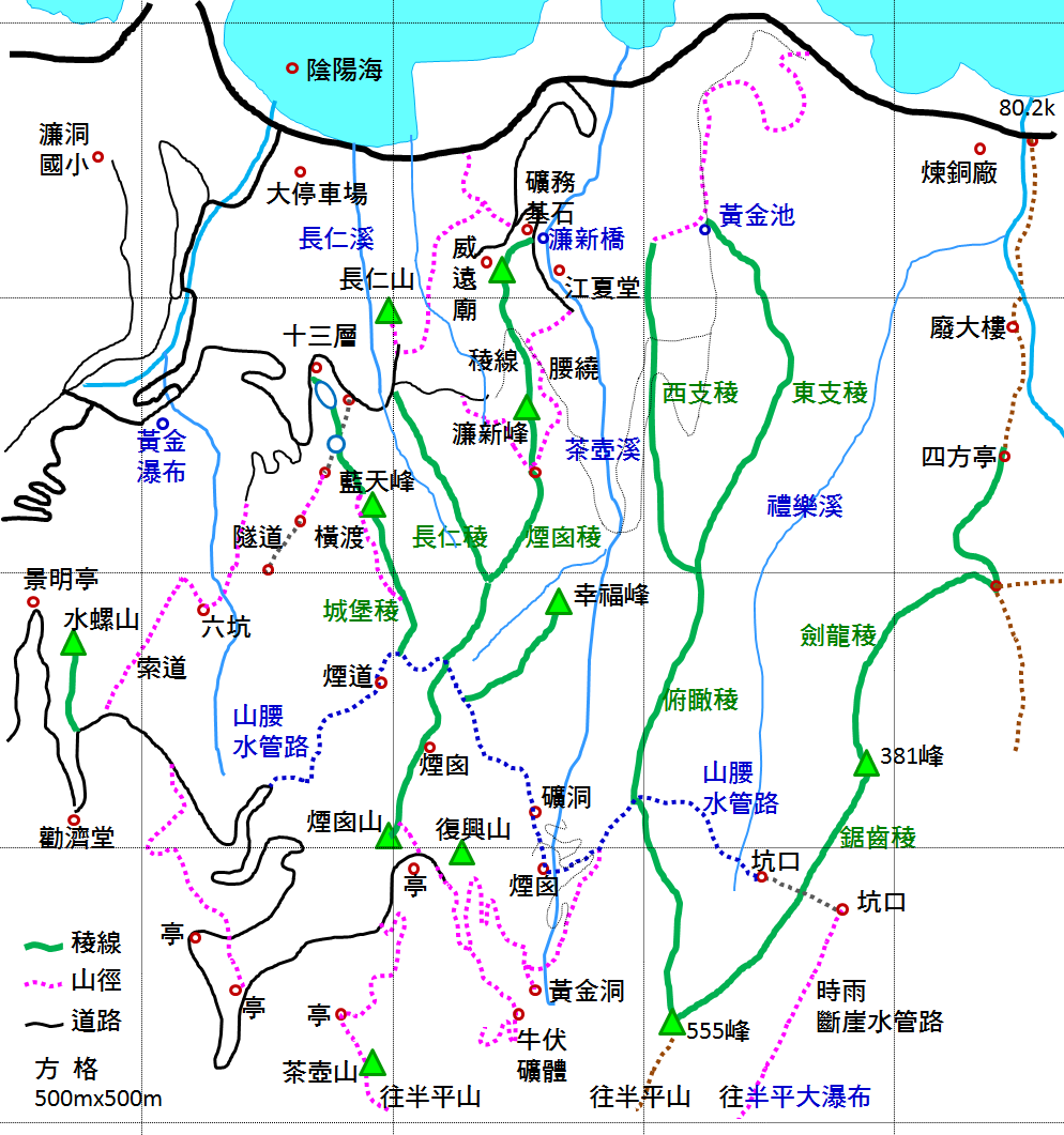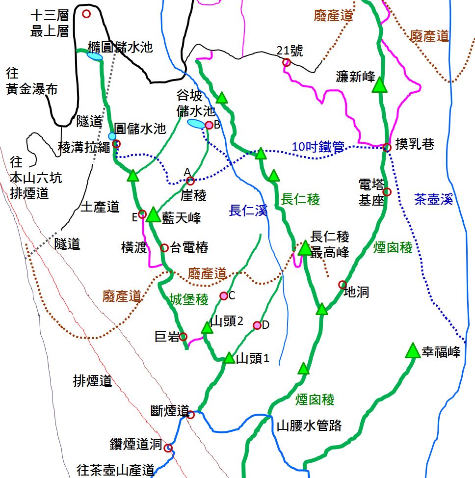 1. 煙囪稜、城堡稜、長仁稜和俯瞰稜。礦務基石原稱水湳山,從地形上稱它是個山,實在是基石基本教義派愚弄山友的作法。