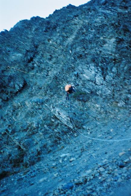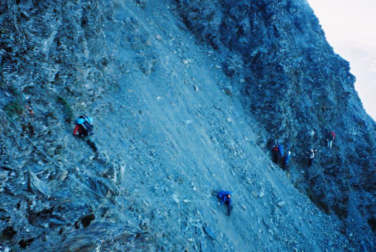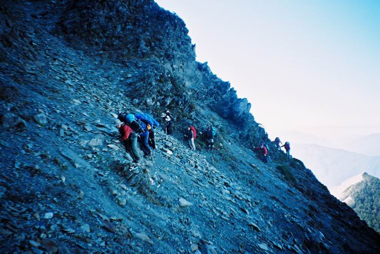 ps.死亡稜線大致上來說,就是先拉已架好的傘帶上一碎石坡,然後連續橫渡三片崩壁,橫渡是死亡稜的精華,天氣好時可以看到斷頭稜的斷頭處,怵目驚心,如果負荷不重,建議可以帶個小鏟子以開闢路跡,先鋒一定得確保,安全第一,橫渡後注意路標就開始之字型往東南的碎石溝方向上切(此處須注意路條位置),上到巨石頂,從兩塊大巨石的中間爬上去就是中央尖山。