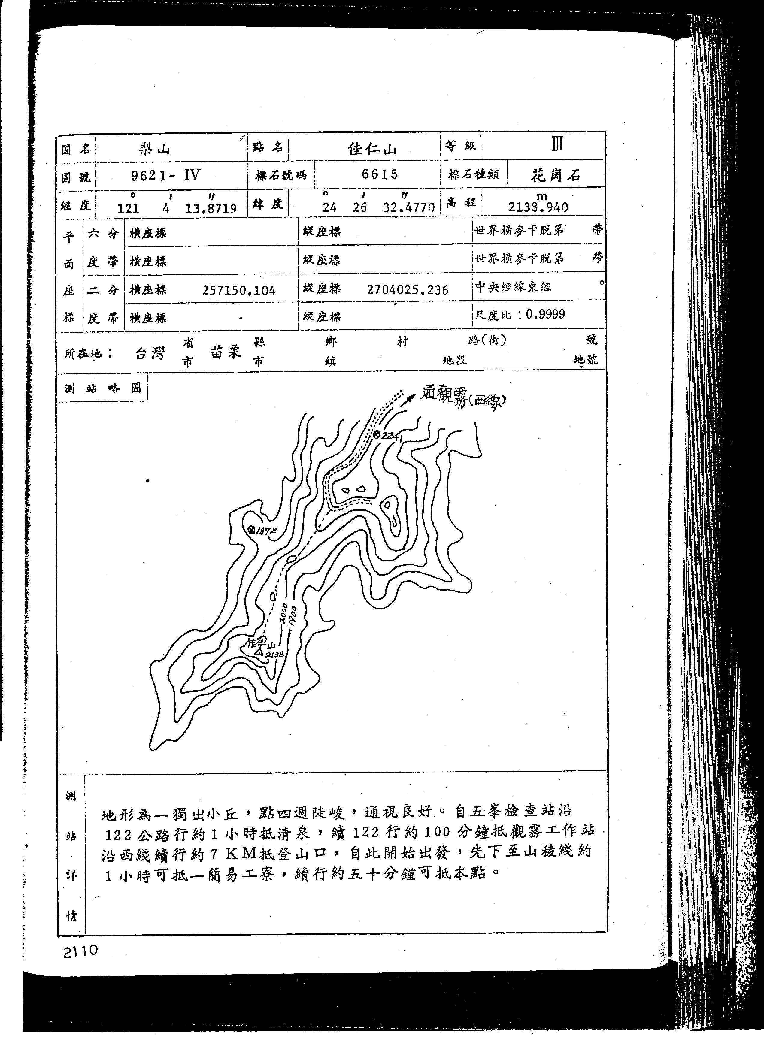 佳仁山 2139M 三等三角點 6615號,座標(257150,2704025)位於苗栗縣泰安鄉