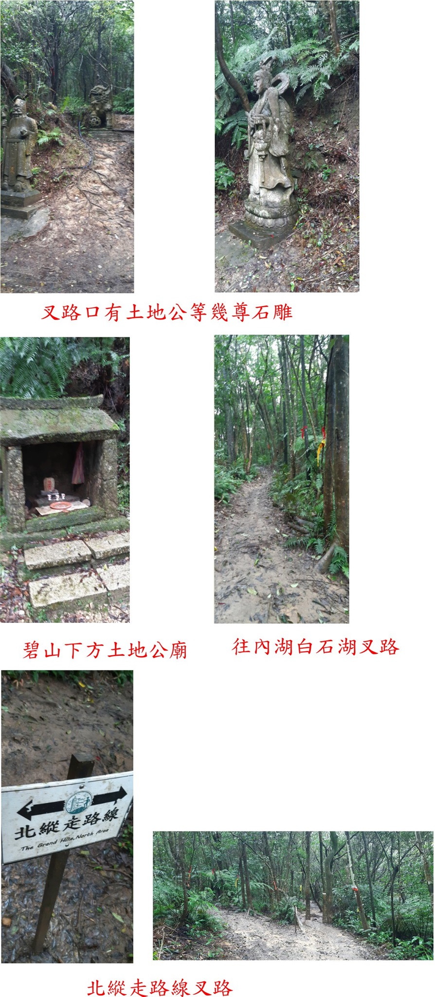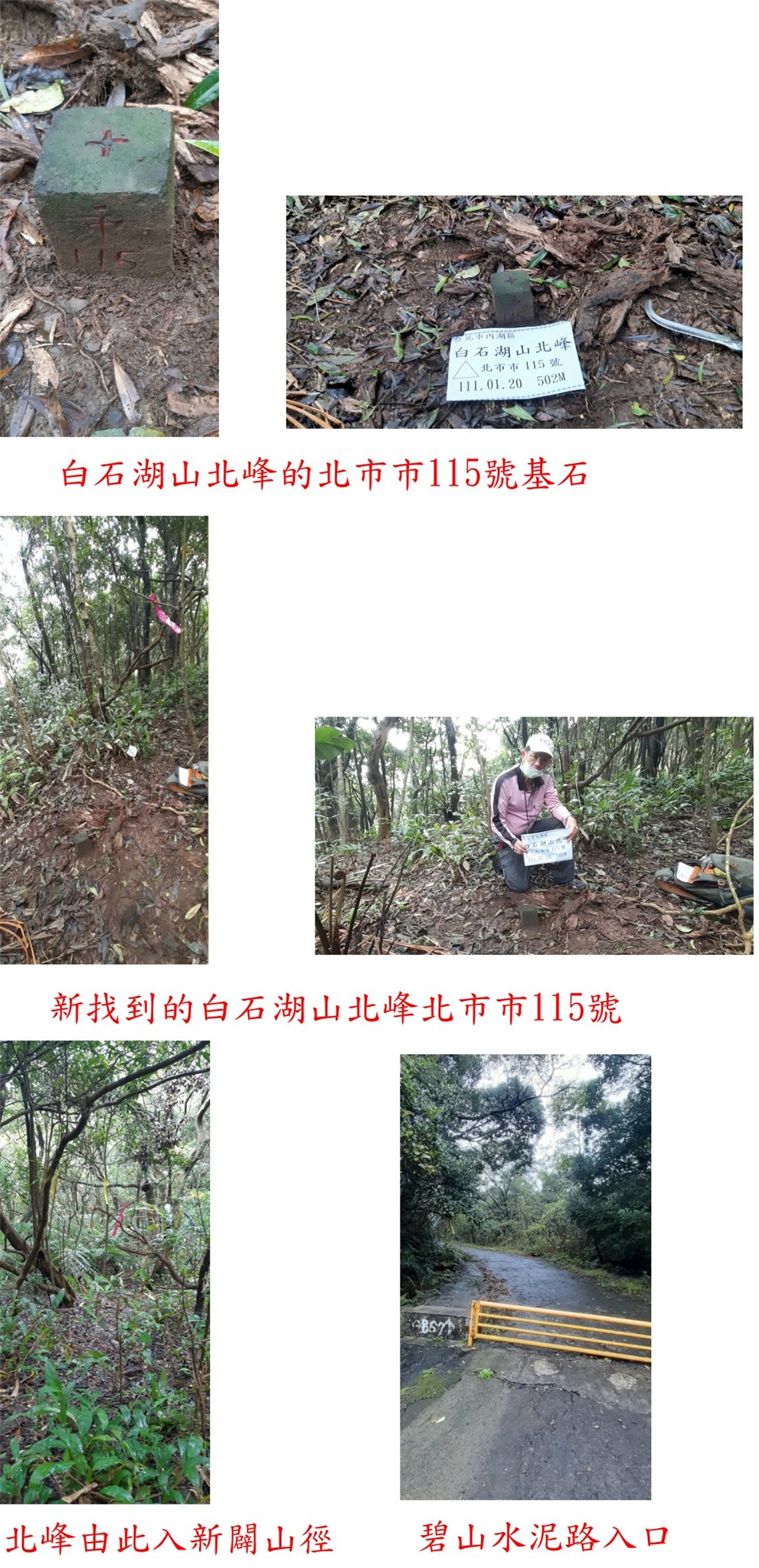 取左入口有擋車水泥墩的水泥路經碧山登山口,走120公尺水泥路底,叉路口有土地公等幾尊石雕,右北縱走路線往北可通往士林(梅花山等),取左大台北縱走第4段往圓覺寺方向走2百公尺土叉路,左可通往碧山與內湖白石湖等;取右土路往往圓覺寺方向2百公尺步道叉路,取右新闢山徑緩上走約60公尺,路旁見到白石湖山北峰的北市市115號;基石於稍低處剛被山友找出不久來補,去程只要12分鐘。