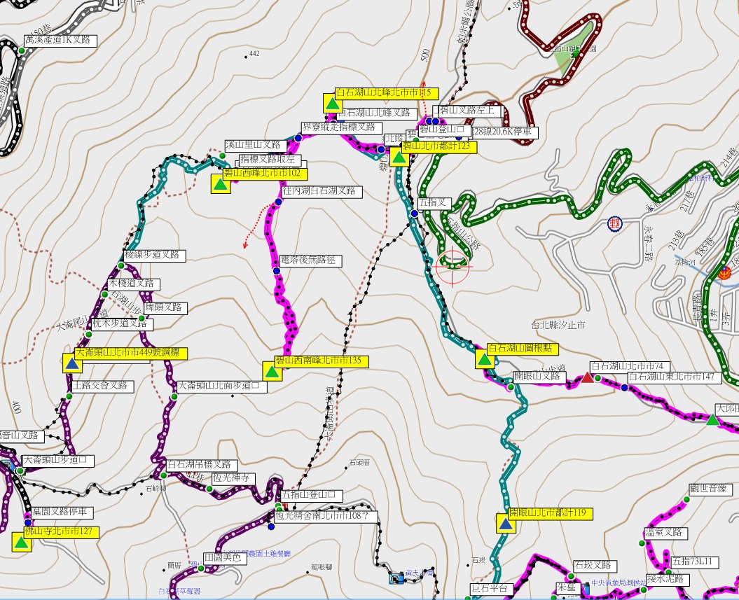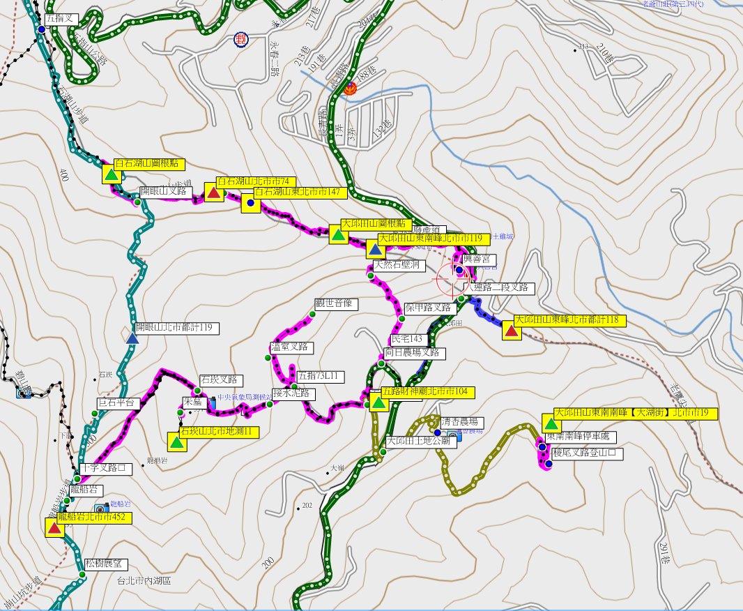 3、白石湖山北峰:位於台北市內湖區,標高502公尺,北市市115號基石;座標3090162778913。