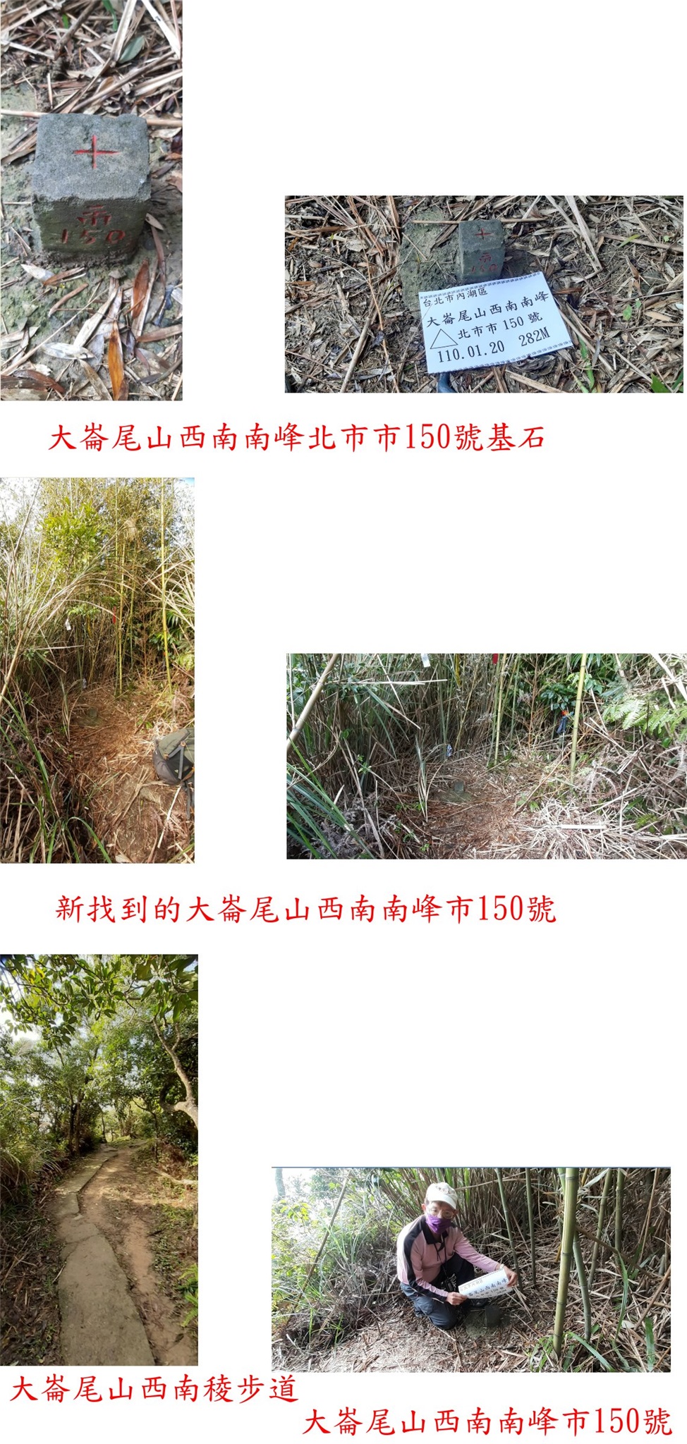 金龍產業道路走約80公尺,取左大崙尾山西南稜步道緩下走120公尺叉路,此步道前接九蓮寺步道可出劍南路;取右稜線山徑走20公尺,於路右細竹叢下方見到崙尾山西南南峰的北市市150號基石;此點以前沒資料不知為何突然冒出?此步道走過多回都錯過來補,只要5分鐘即輕鬆入袋,此點往返費時14分鐘。