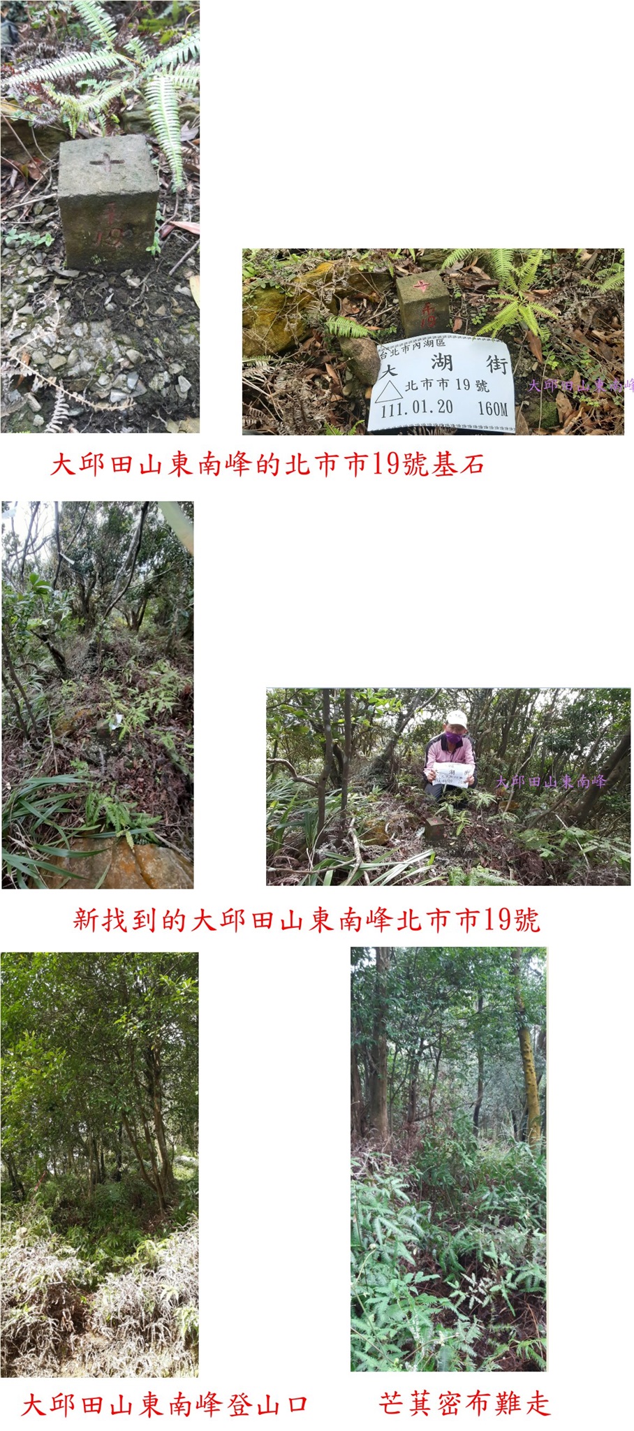 往前走40公尺叉路,由稜尾自行闢路植被為芒萁叢很難走,順稜走120餘公尺於山頂見到大湖街的北市市19號基石,無紀錄來找看看竟然還在;山頂東北面可眺望新山等、西北面為白石湖山連稜山頭,山頂有一路條代表曾有山友來過但可能未發表;此點稱「大湖街」離大湖街有段距離且範圍太廣難辨識,個人認為此點應稱為大邱田山東南南峰較妥適;此山上山走10分鐘,往返費時29分鐘,早上半天找到5顆基石收兵返家。