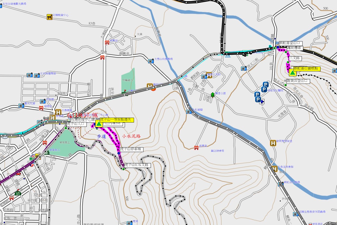 由學子波山回至銃櫃巷1.2K的工寮叉路,取右小水泥路下坡至1.6K叉路,右上往檳榔園不取;取左續下坡至2.1K的乾溪底(車建議停此),前方轉為土路、只適合4W通行,上坡至約2.5K叉路,右上檳榔園有鐵門,於此午餐,此處有一小段的水泥路面;午餐後續行至2.6K寬闊地停車,高