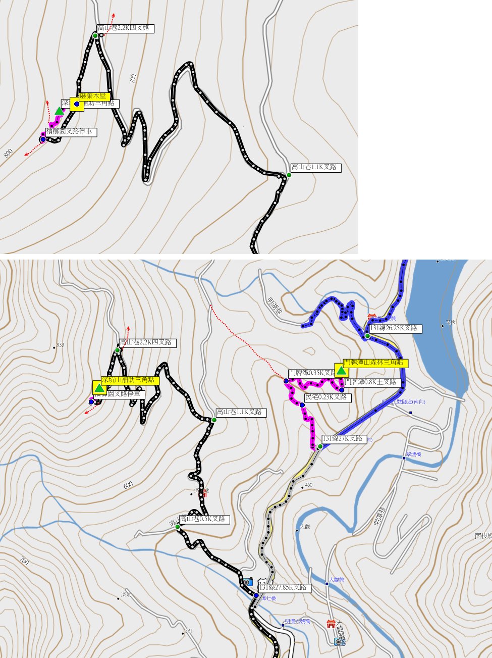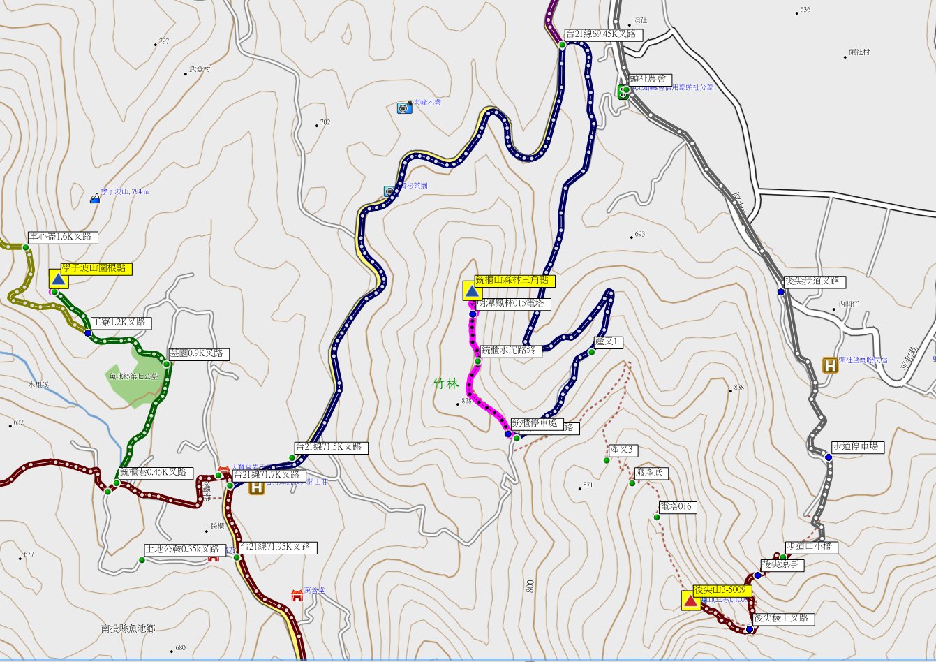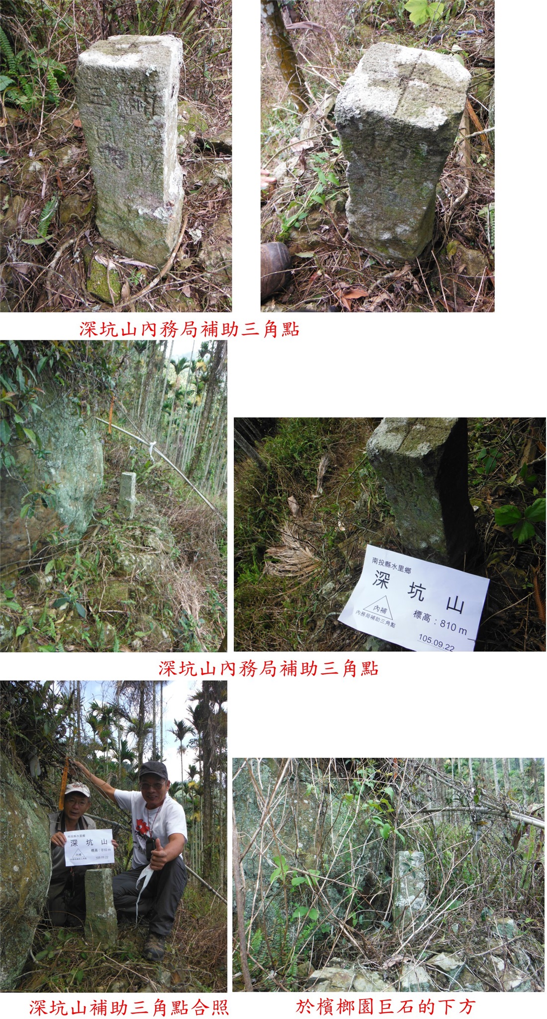 1、深坑山:位於南投縣水里鄉,標高810公尺,內務局補助三角點;座標234450 2639170。
