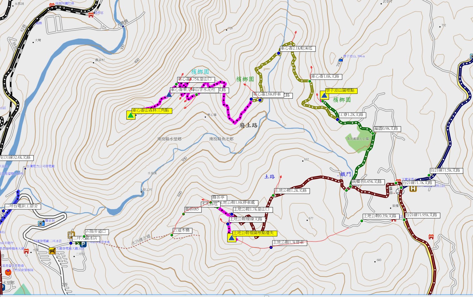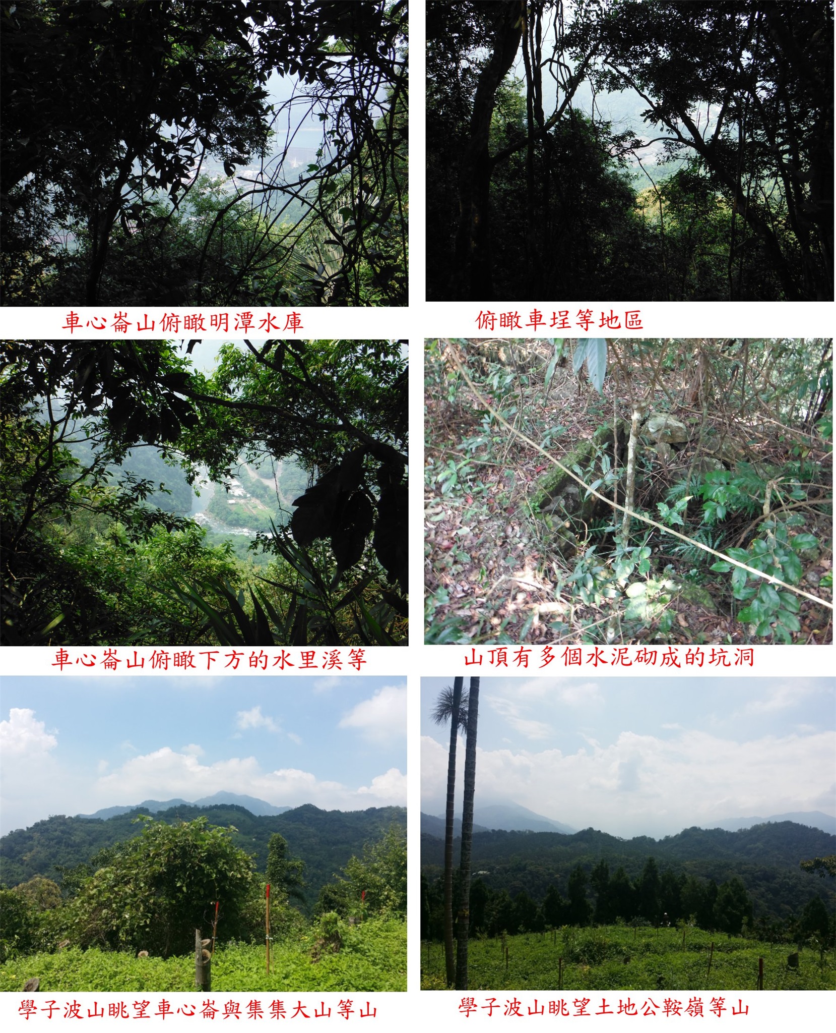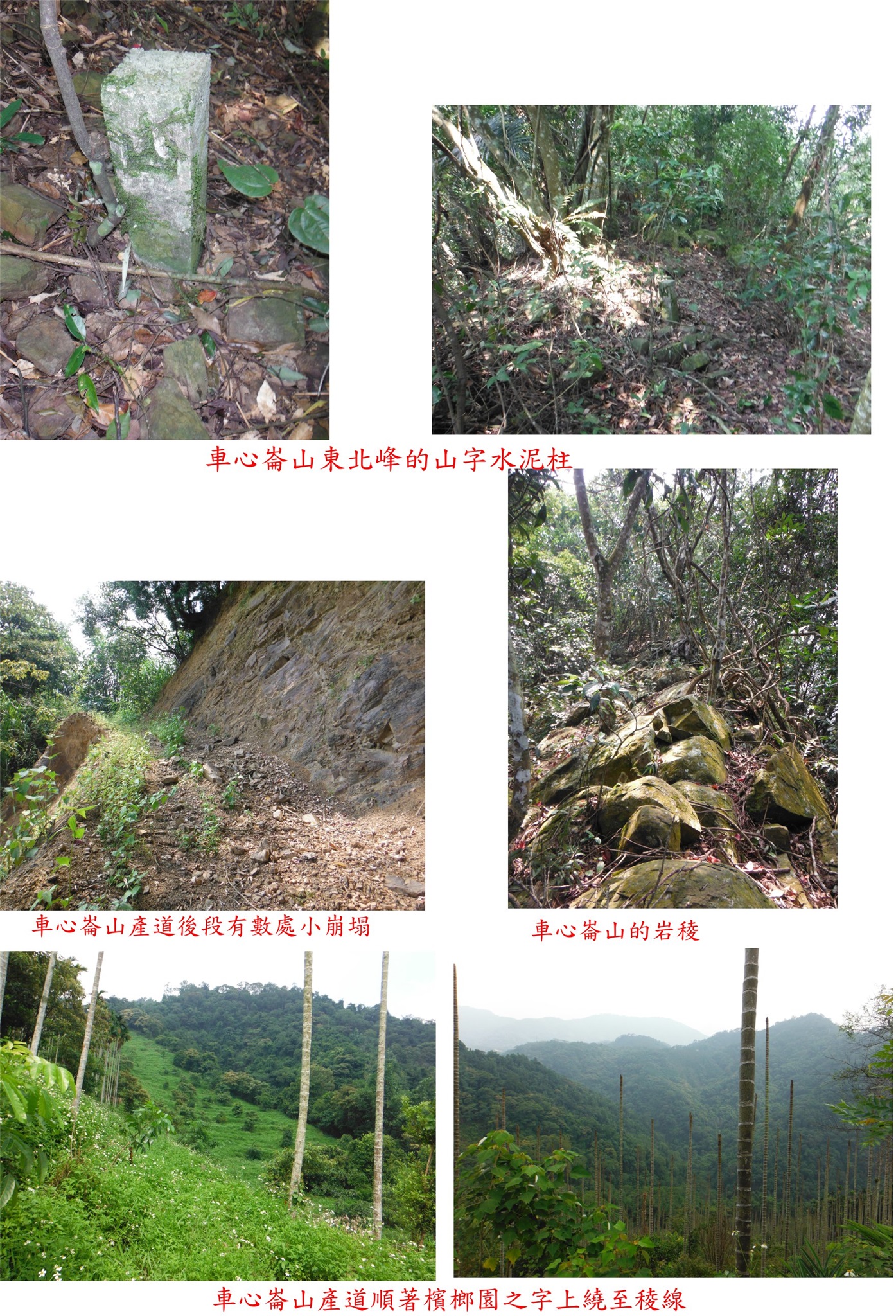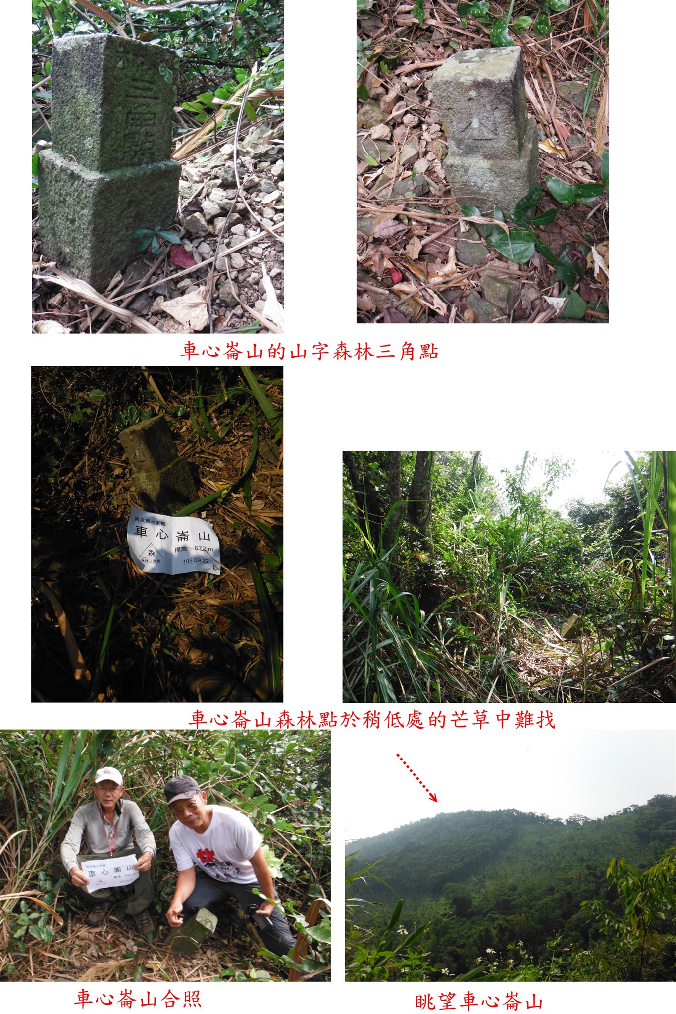 4、車心崙山:位於南投縣水里鄉,標高672公尺,森林三角點;座標235400 2635465。
