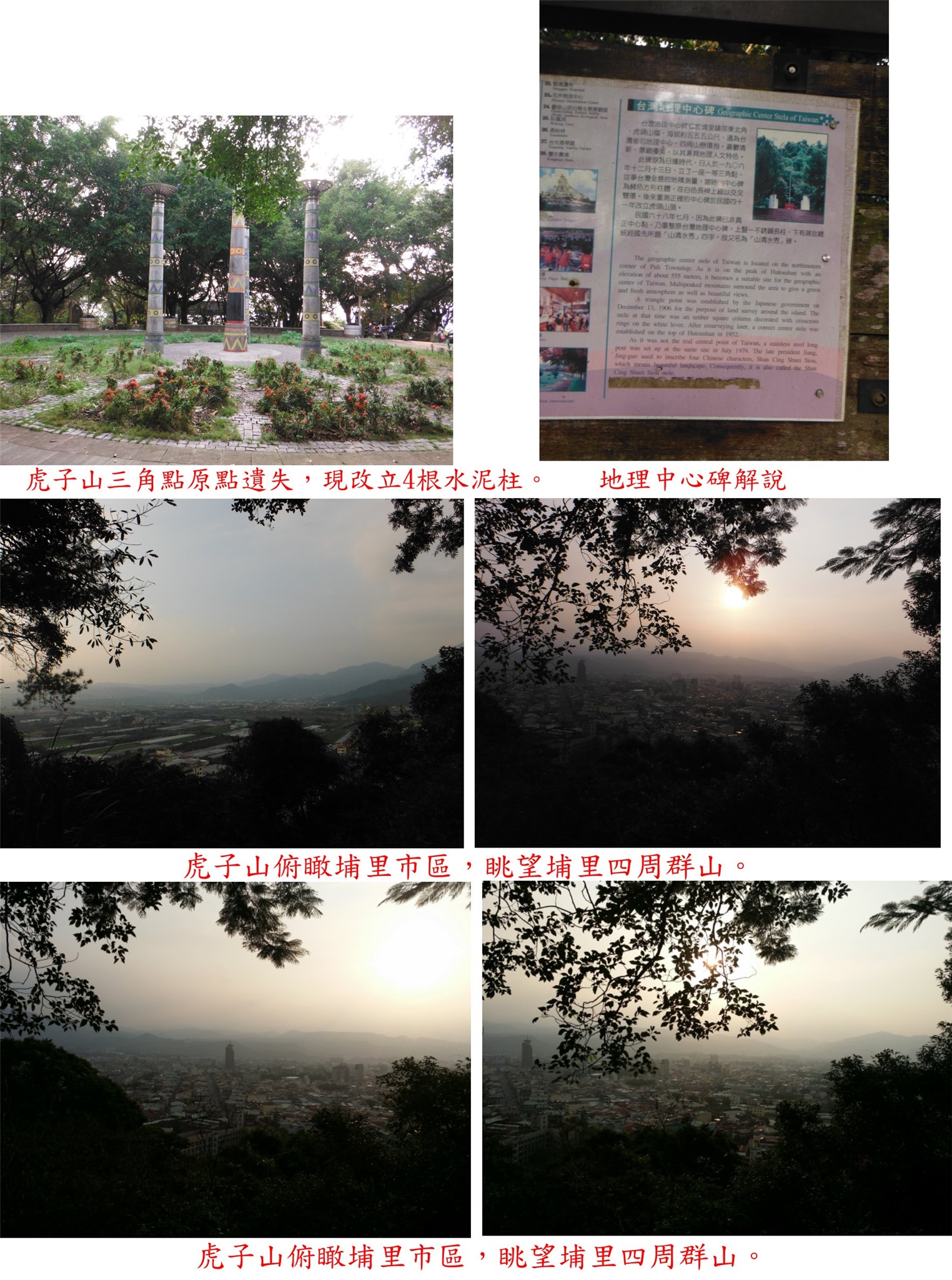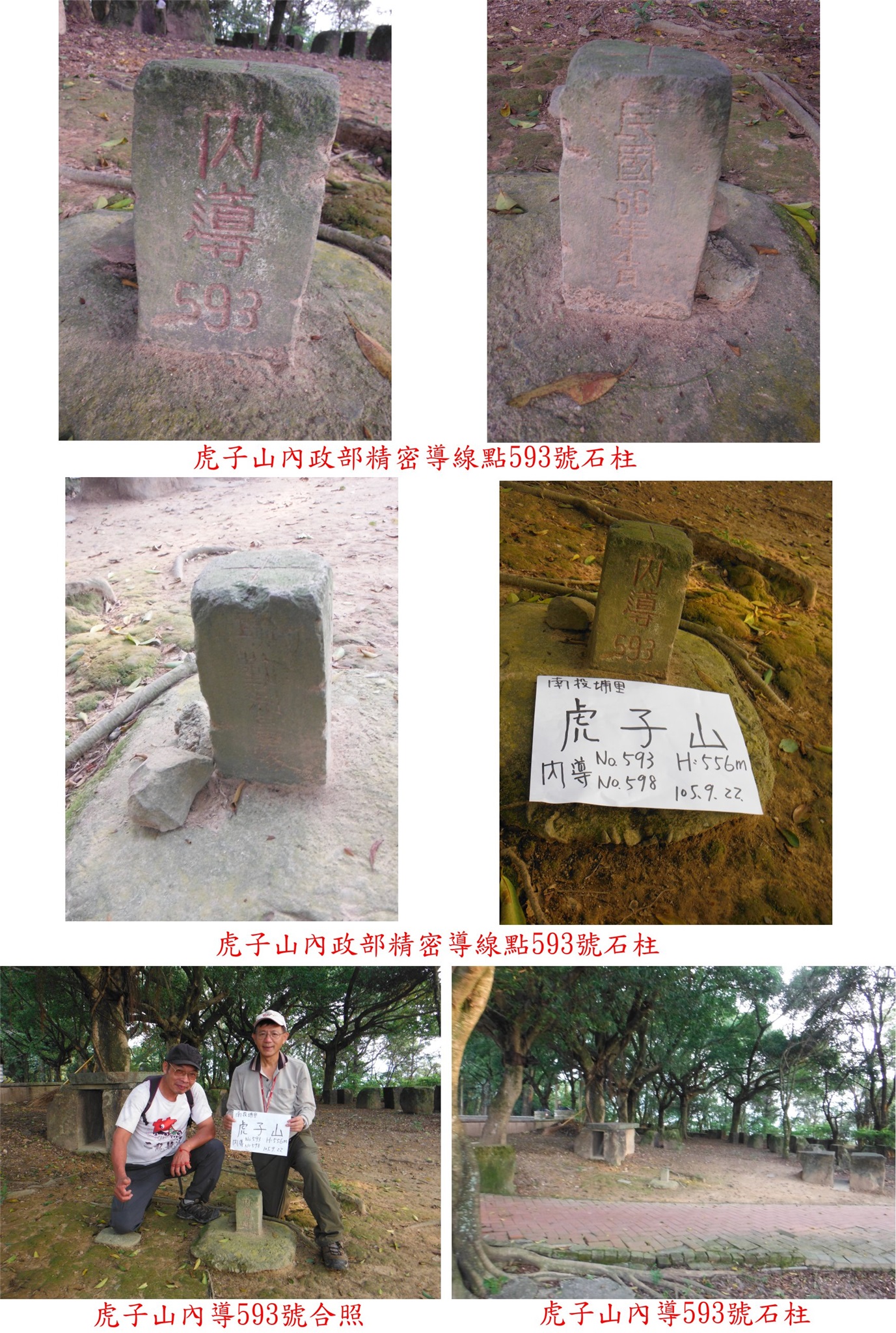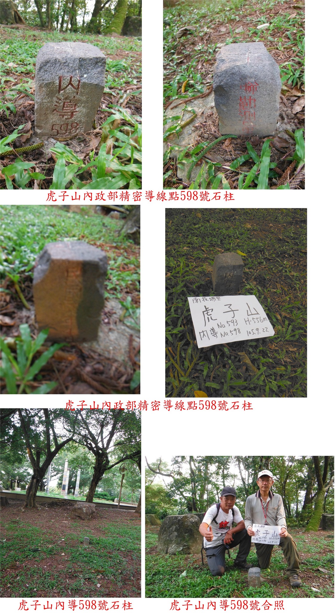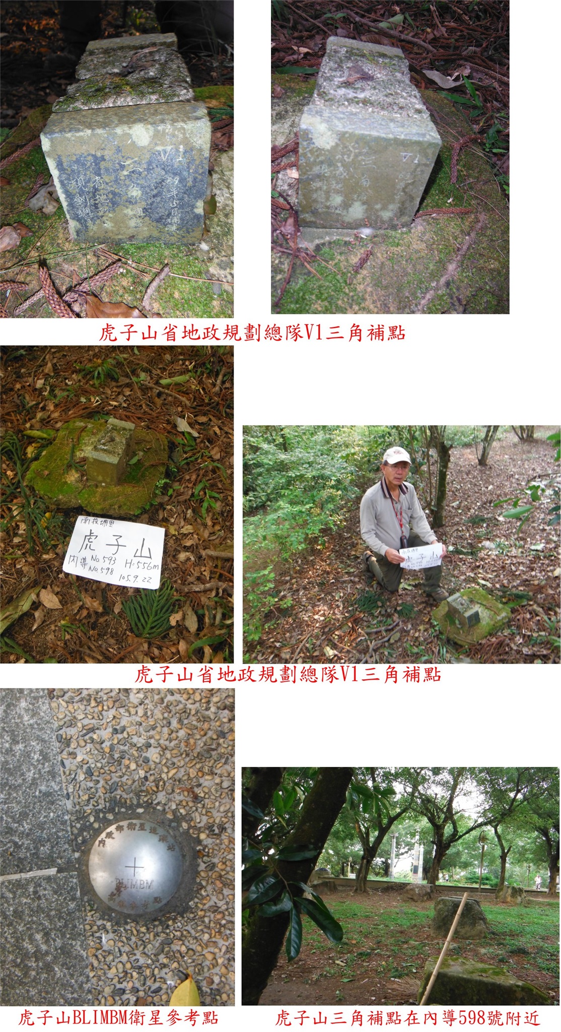 6、虎子山:位於南投縣埔里鎮,標高556公尺,原有的一等三角點與圖根點均遺失,另立的內補三等三角點銅標也已遺失;四顆內導石柱也只剩下內政部精密導線點593與 598號等2顆基石;座標分別為247308 2652343與247324 2652320,旁另有規劃總隊V1三角補點(247326 2652315)。