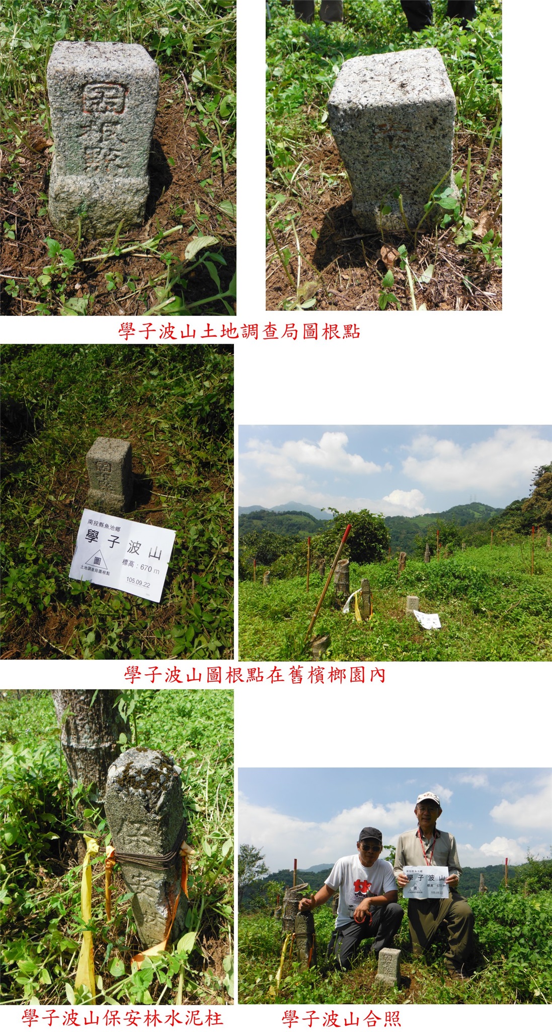 3、學子波山:位於南投縣魚池鄉,標高670公尺,土地調查局圖根點;座標236772 2635579。