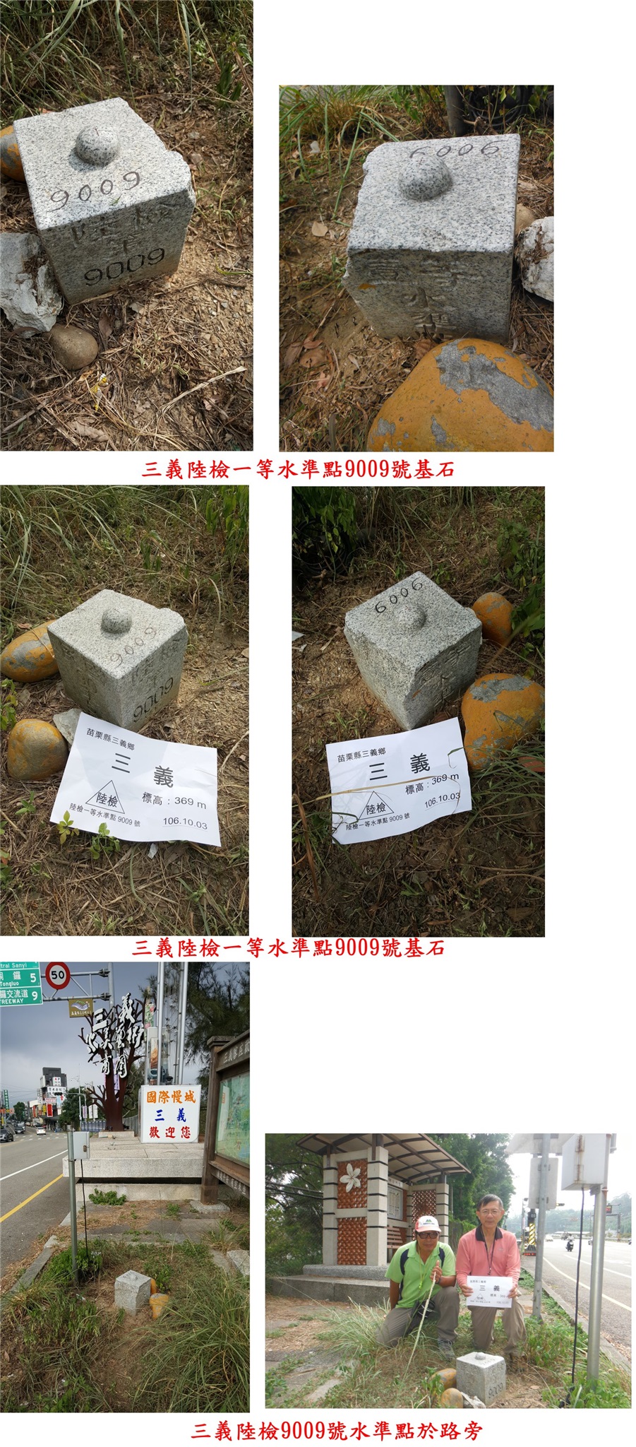 過馬路至對面候車亭,即見到三義陸檢9009號一等水準點,聯勤測量隊埋設於90年5月,屬後期所立的水準點;此點係祥馬兄新找到的遠道來補,基石於「三義歡迎你」標示牌旁導覽圖下方,往南走