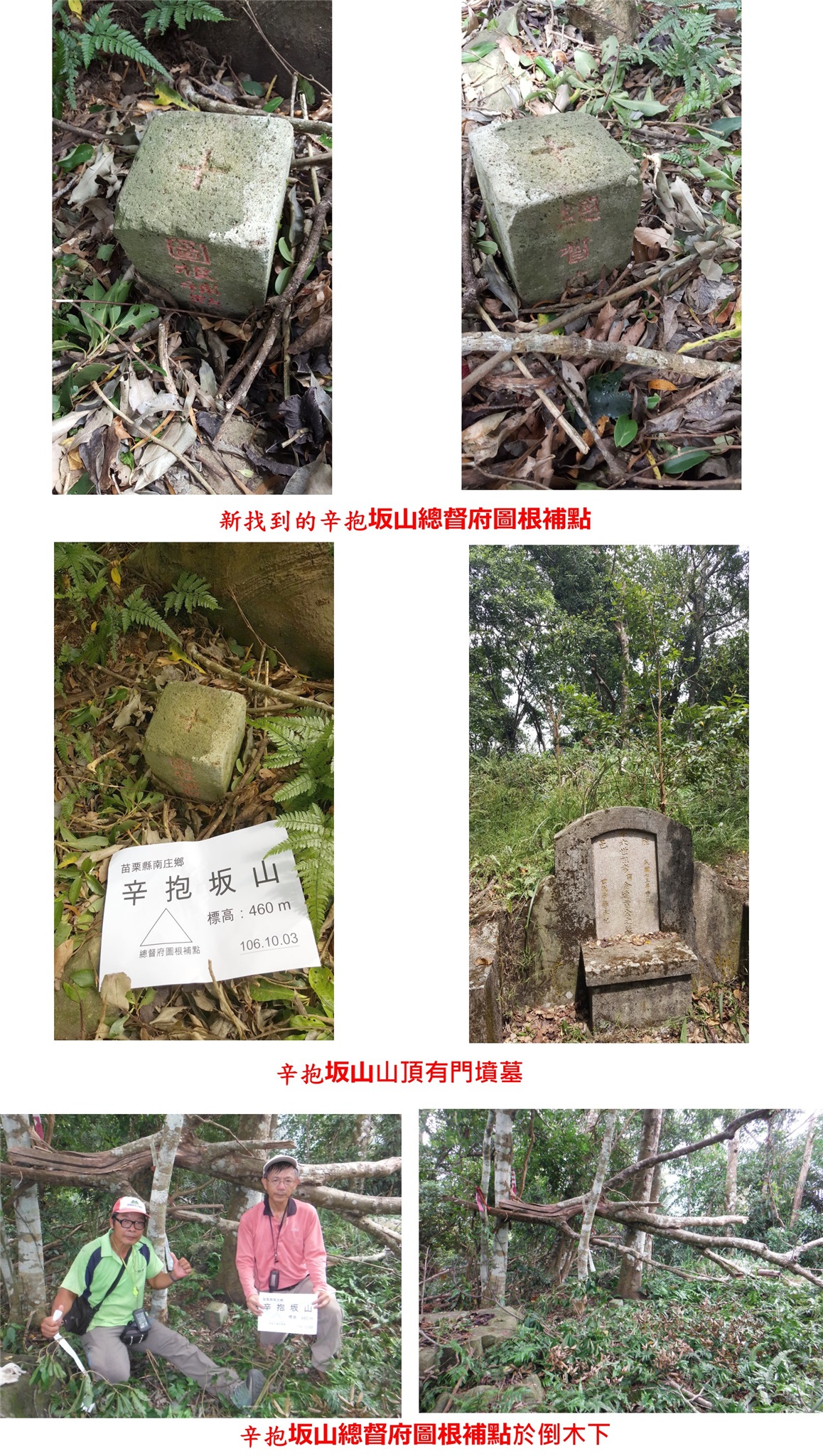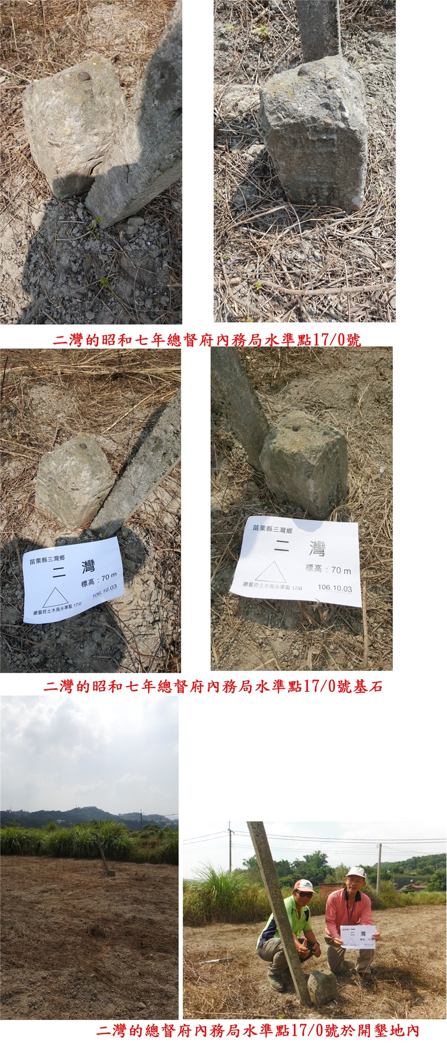 10/3約王哥先去新竹地區找到高平20/0等4顆町杭,再來轉往苗栗頭份與三彎摸山友新找到的大營三角點4、四分子14/0與二灣17/0等3顆水準點町杭,這些基石於中港溪旁,立於昭和七年間,屬後期所立迄今也有85年歷史,亦為內務局所立,有一面刻劃「三角點」與土木局所立有異,感謝台中的山友遠道來帶路。