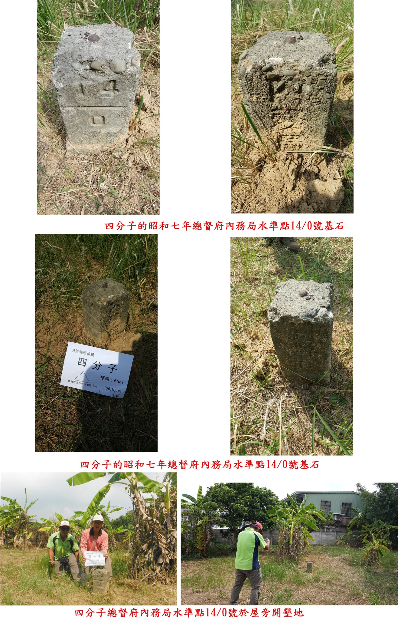 2、四分子:位於苗栗縣頭份鎮,標高89公尺,總督府內務局水準點14/0號;座標: 244700 2730537。