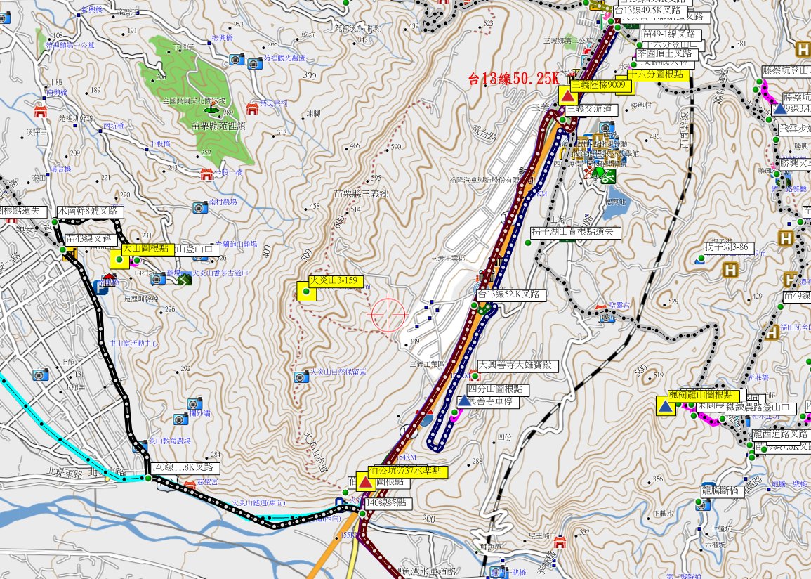 午餐後由蓬萊國小走124線往南走15.7K,左轉台3線往南走12.1K,右轉上72號快速道路走9.8K;於銅鑼交流到下接128線往西走3.1K,左轉台13線往南走11.7K(50.25K),於裕隆汽車大門口旁停車,此趟路程為52.9K有夠遙遠。