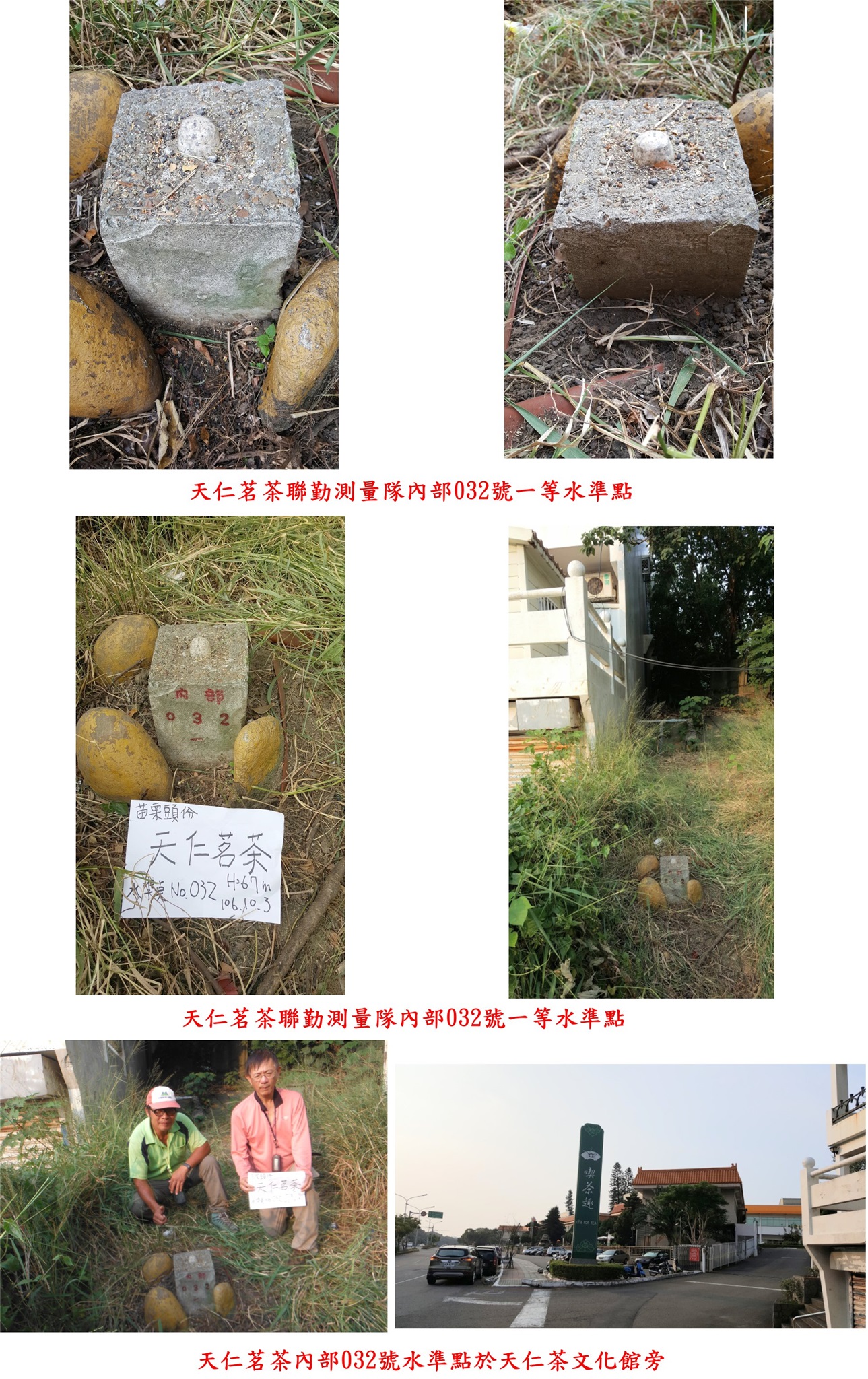 8、天仁茗茶:位於苗栗縣竹南鎮,標高67公尺,聯勤測量隊內部032號一等水準點;座標: 241146 2734497 。