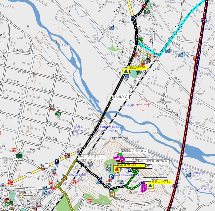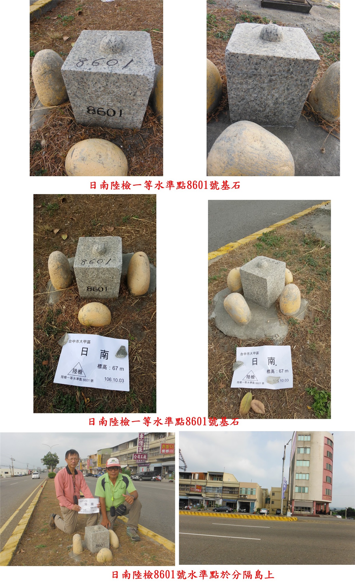 7、日南:位於台中市大甲區,標高67公尺,陸檢一等水準點8601號基石;座標: 224703 2698985。