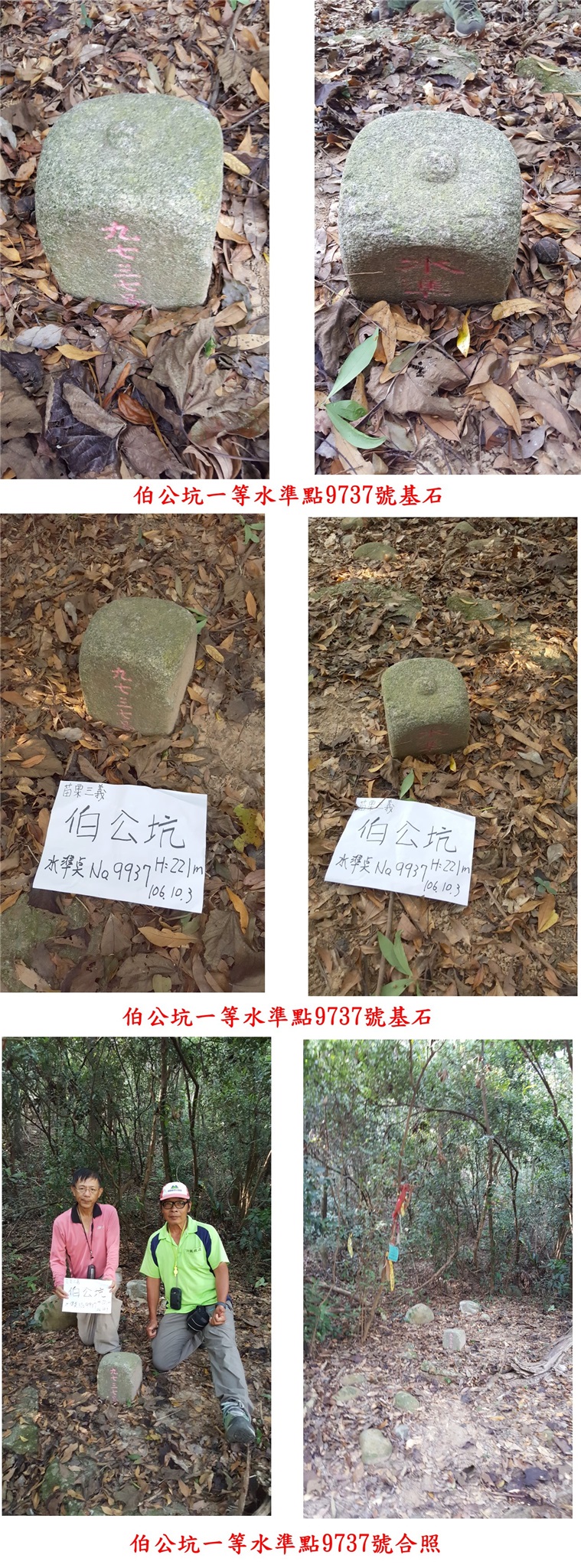 6、伯公坑:位於苗栗縣三義鄉,標高191公尺,一等水準點9737號基石;座標: 222453 2695169。