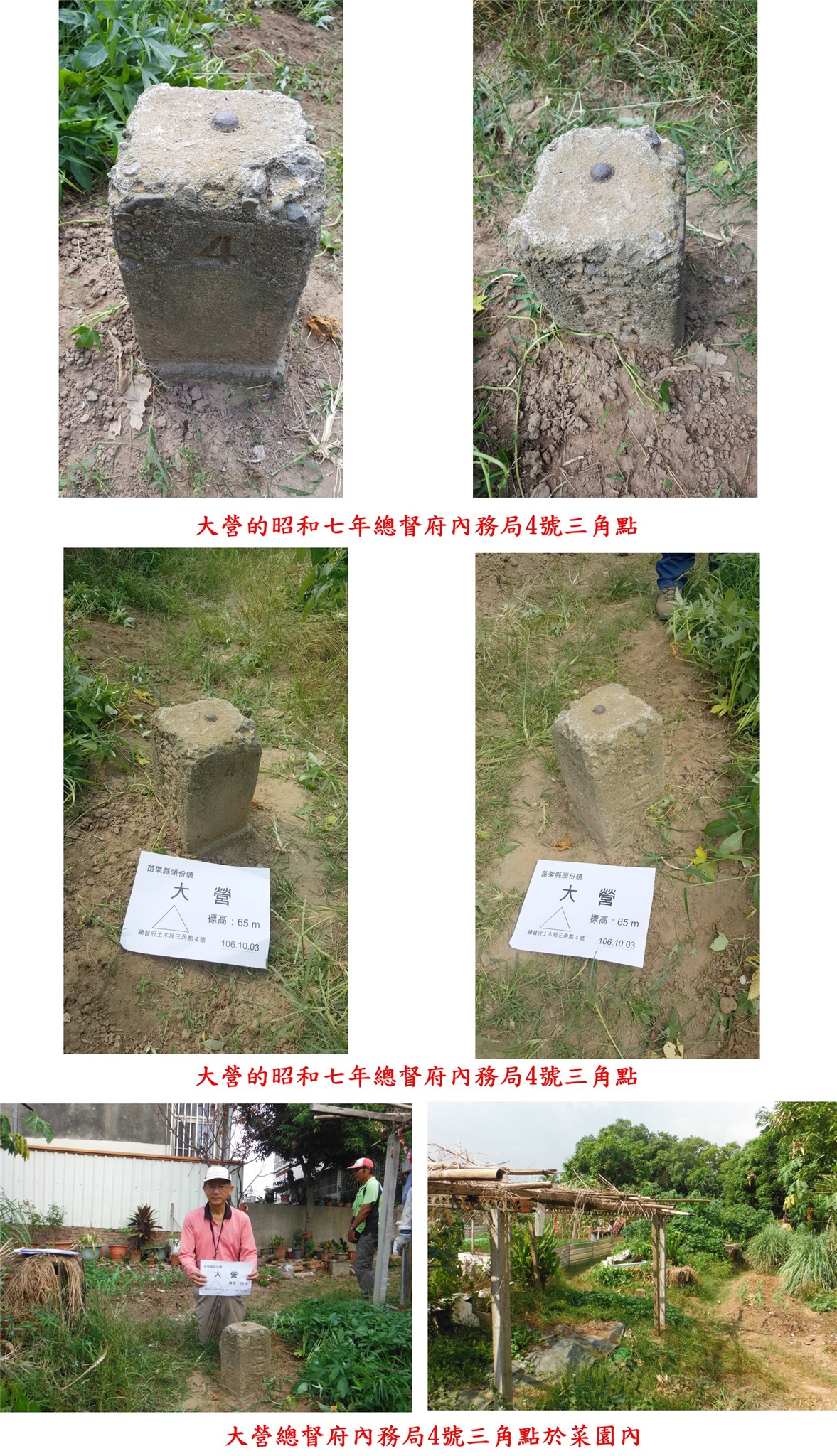 左入巷弄至大營路68巷9-2號民宅巷底,由圍牆缺口進入菜園,找到大營的昭和七年總督府內務局4號三角點,為後期設立的補助三角點,也有85年歷史了;基石靠近與另一菜園交界的圍籬旁明顯好找,見到廣興兩公婆新的路條,好久沒看到以為歸隱山林了,此點屬中港溪北岸的町杭。