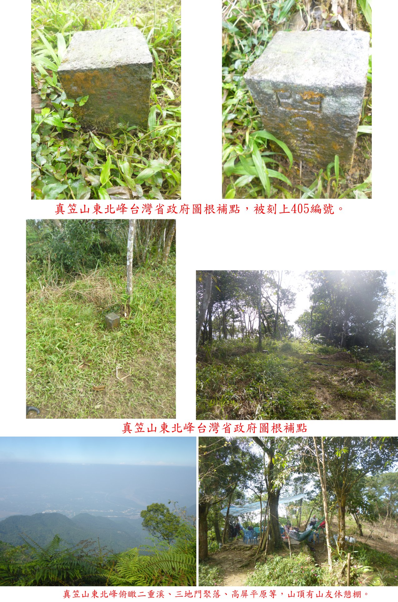 10:57△真笠山東北峰,位於屏東縣瑪家鄉,標高1200公尺,台灣省政府圖根補點;山頂俯瞰俯瞰二重溪、三地門聚落、高屏平原等,有一群山友在此野餐;山徑續行往鱈葉根山,應另有山徑出林道約4.3K處,詢問山友似乎不知道。
