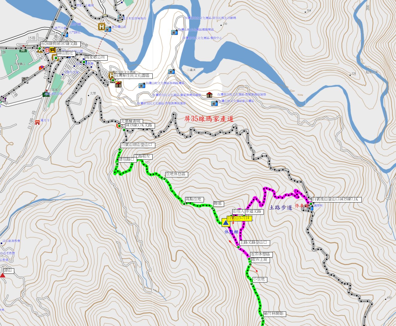 06:45由昨晚夜宿的屏山旅社走自立路進入瑪家聚落,前接屏35線(瑪家道路)經原住民文化園區前,右轉續往山上走,至約3.5K的北葉檢查哨;前叉路右轉走230公尺即白賓山前山步道登山口,高331公尺,此線較陡且遠不取,續走屏35線,沿途眺望三地門部落、三地門、德文等山。