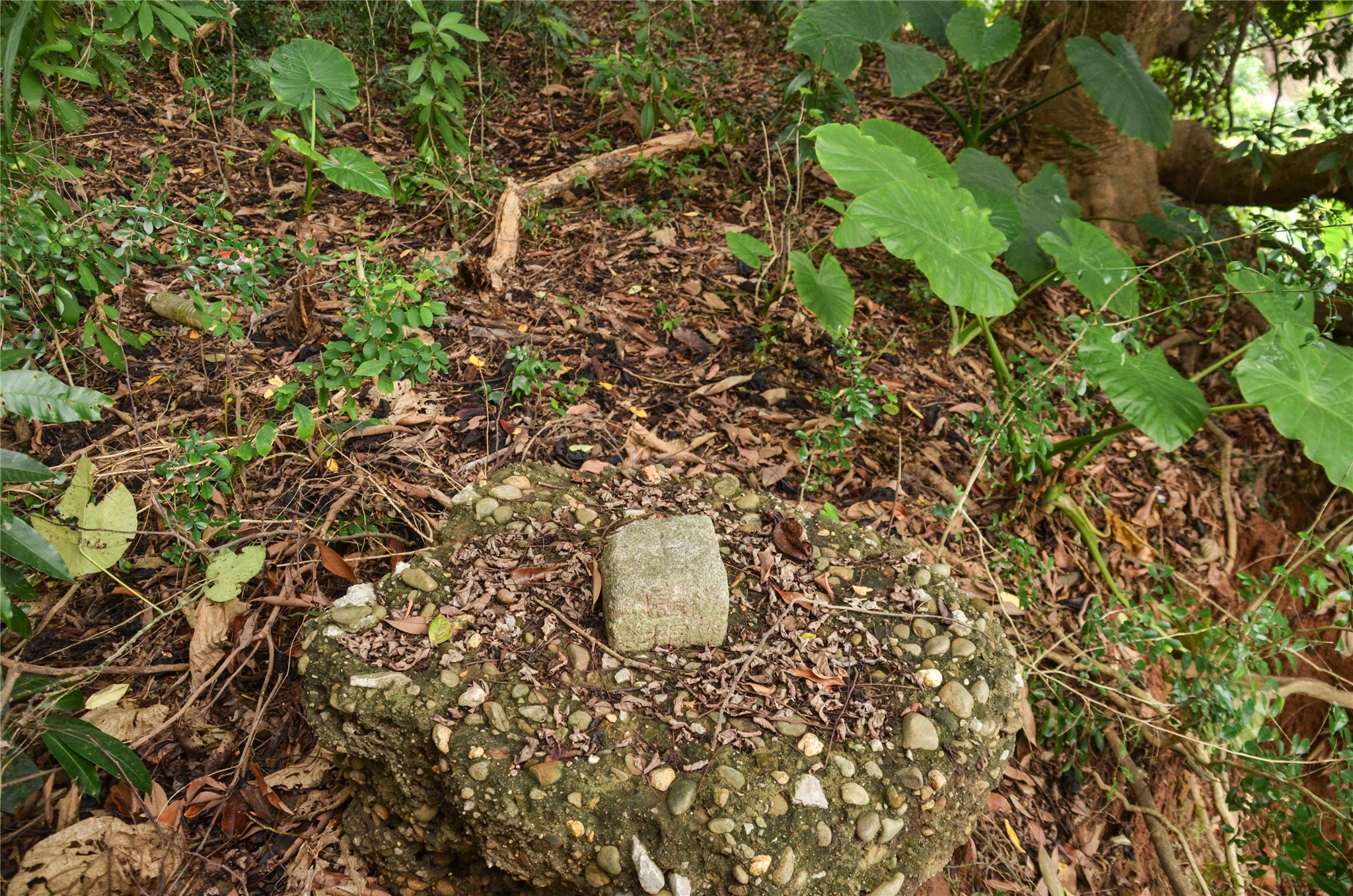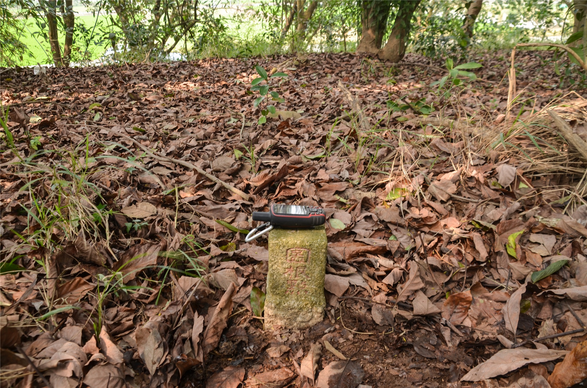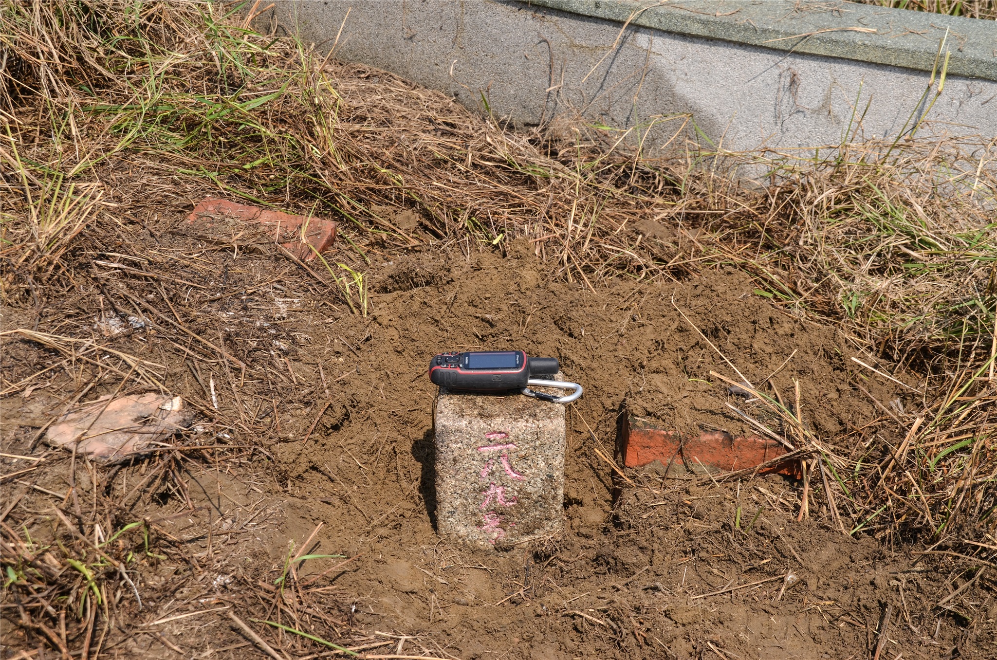 右上路旁的土丘走約30公尺,即可見到頭叩圖根點,座標194654 2607617;土丘上鋪滿落葉,基點明顯好找。