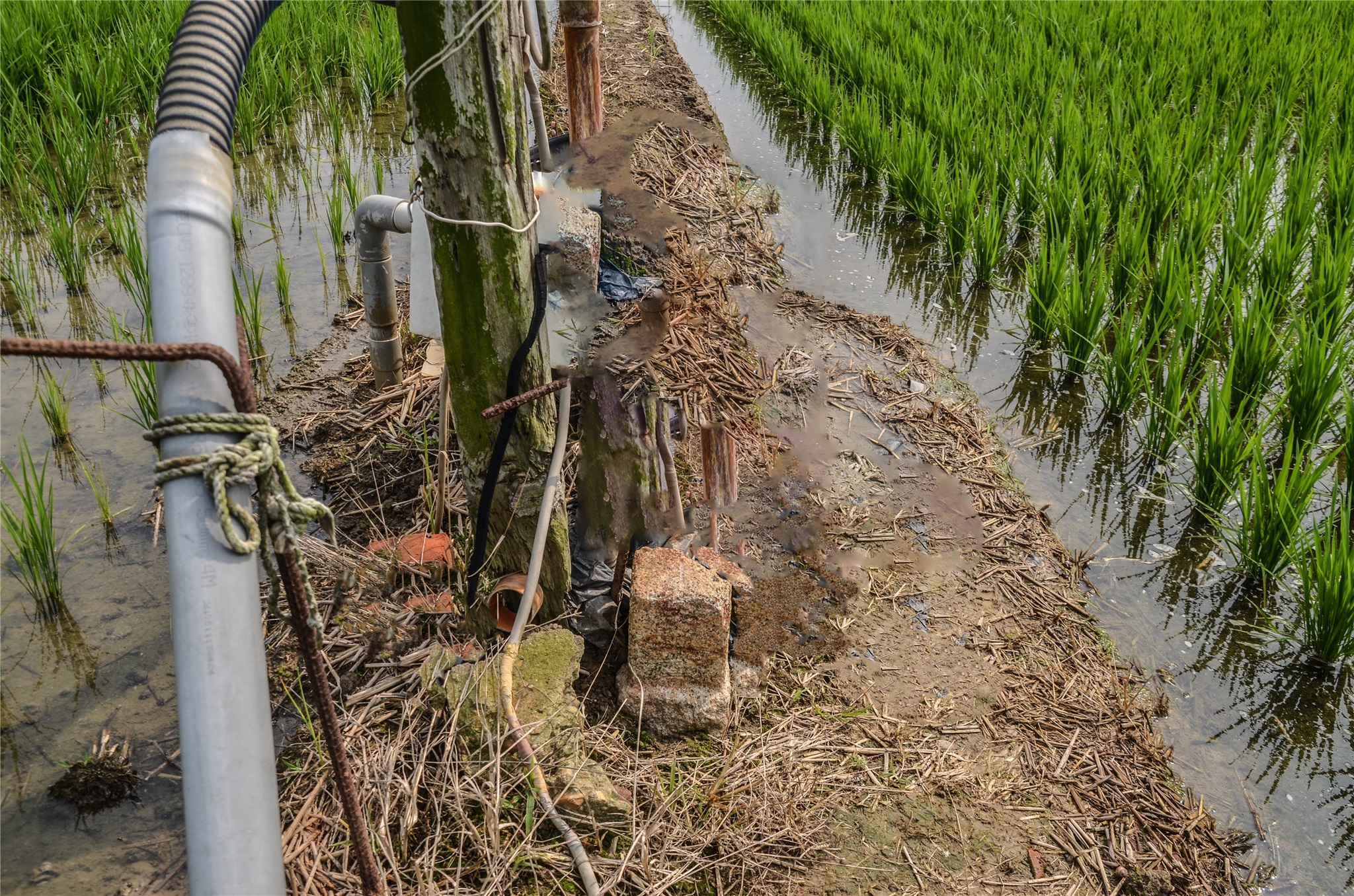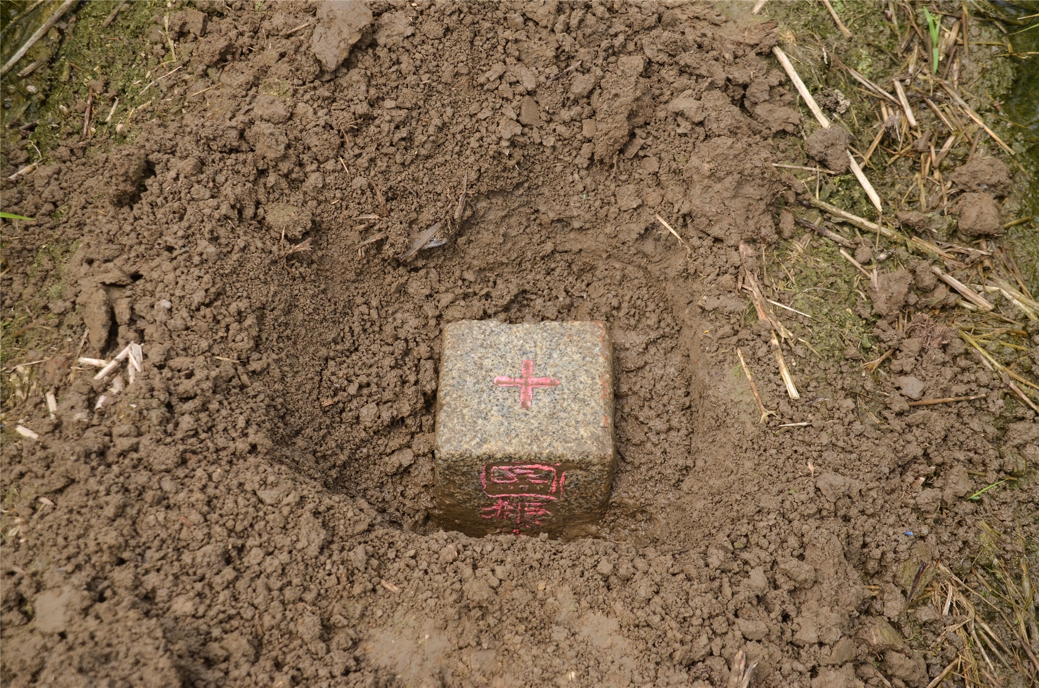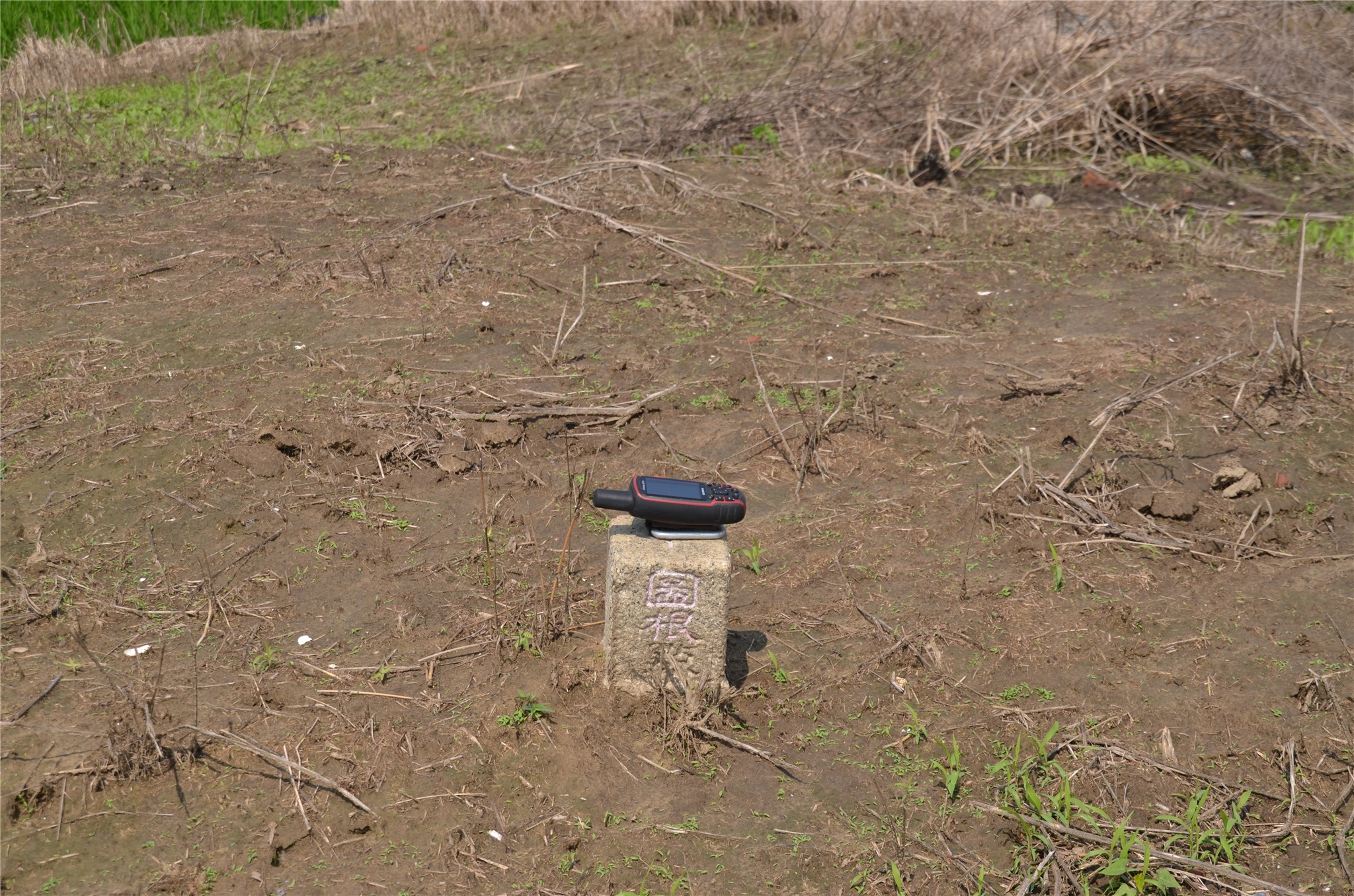 右入田埂北向走約7公尺為鴨母坔圖根點點位,圖根點深埋田埂下,用十字鎬敲了一陣子才敲到,挖出拍照後再恢復原狀,圖根點座標189549 2604432,距北邊抽水設備約10公尺。