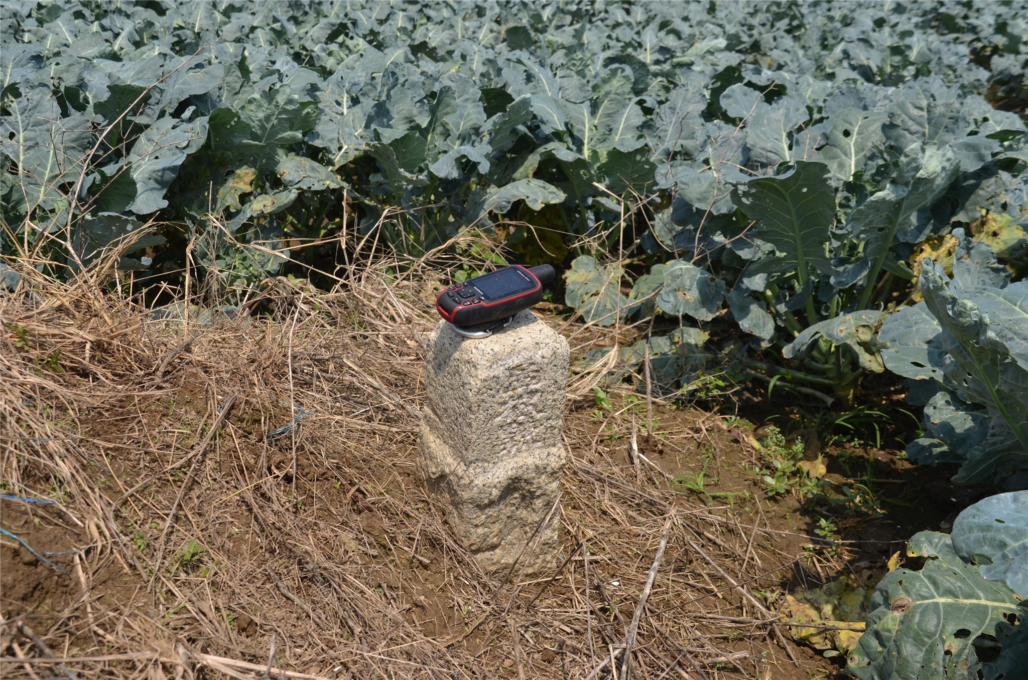 右入茄苳樹樹林北側水泥田埂、經一家族墓塔走約70公尺,原栗子崙冠字藤(13)的土地調查局圖根點立在左邊旱田草地上,但現場已填土高約1.5公尺,並加築擋土牆,基點已遭掩埋遺失;2018.11.10山友王哥將新竹寶山冠字野(16)的八古山圖根點移置擋土牆南端,但今天造訪時發現已遭拔起橫放擋土牆角,座標166476 2593363。