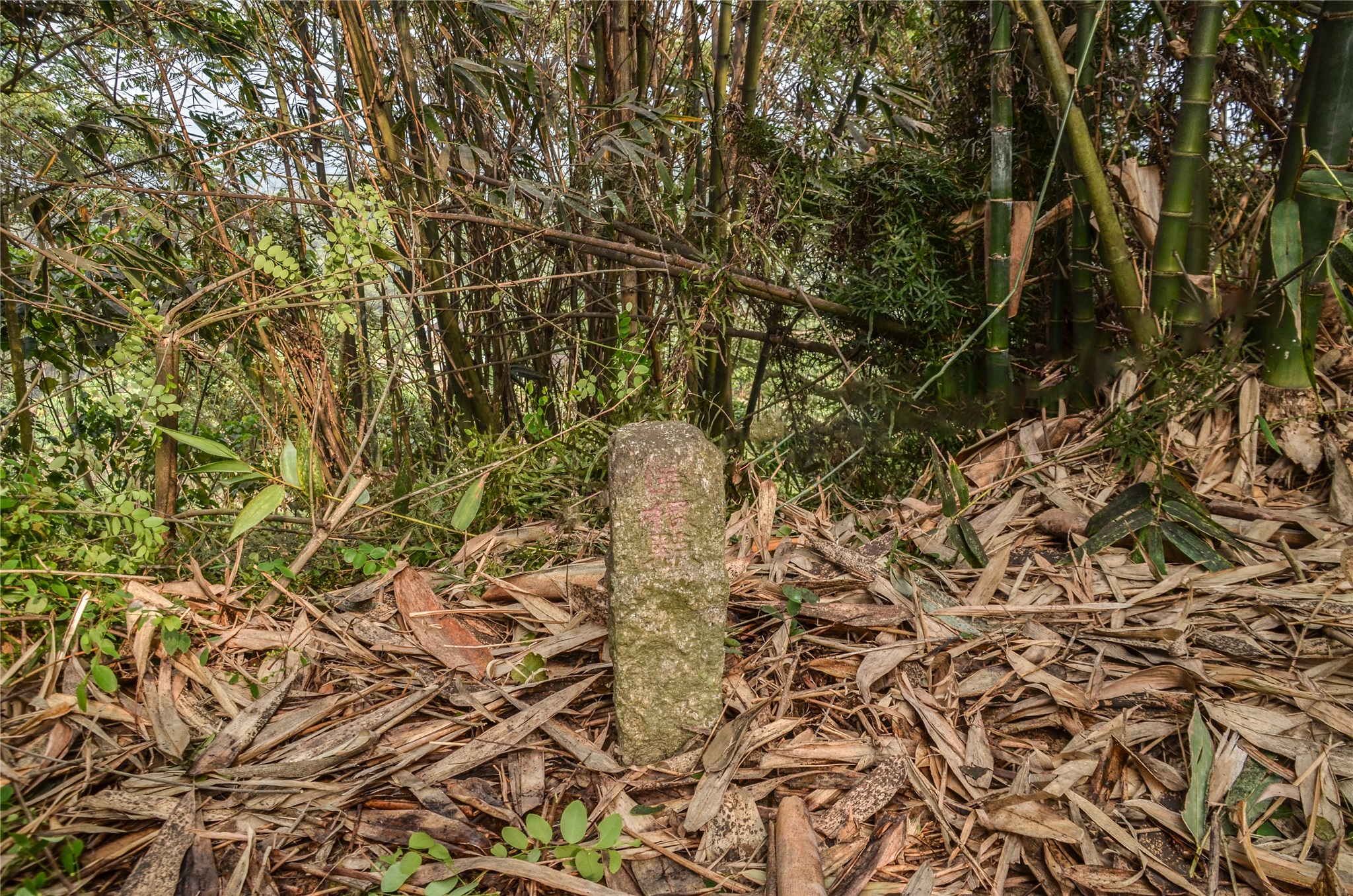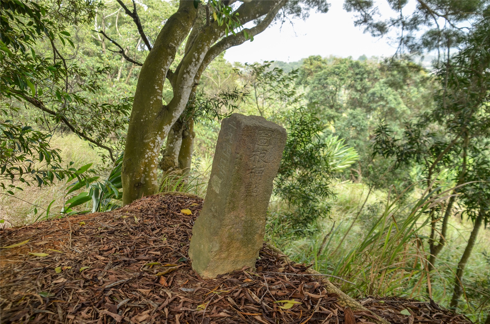 由停車處穿過甘蔗園南行,行約190公尺抵一小山丘,爬上小山丘即見到山坑庄上省府圖根補點位在崖邊相思樹下,座標198096 2605398。