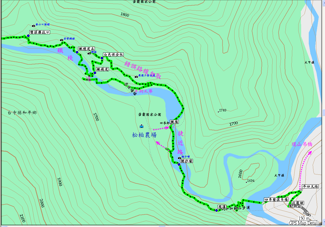 17:30 開回流龍頭空地後,前往四季蘭溪(司界蘭溪)吊橋探路,資料上說明吊橋長度約30公尺,看來不像,遂由GPS導航測量吊橋長度,竟然長達120公尺。