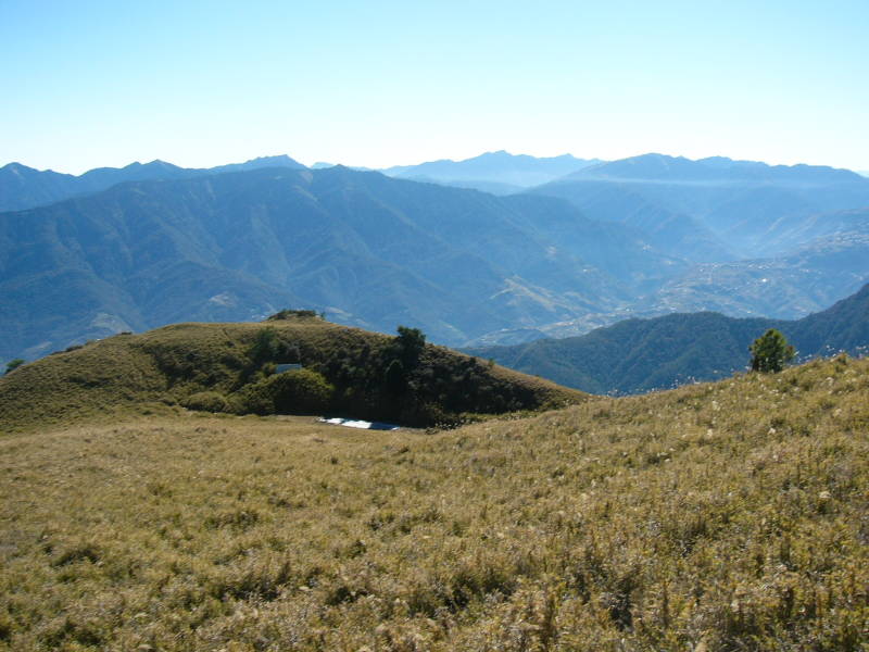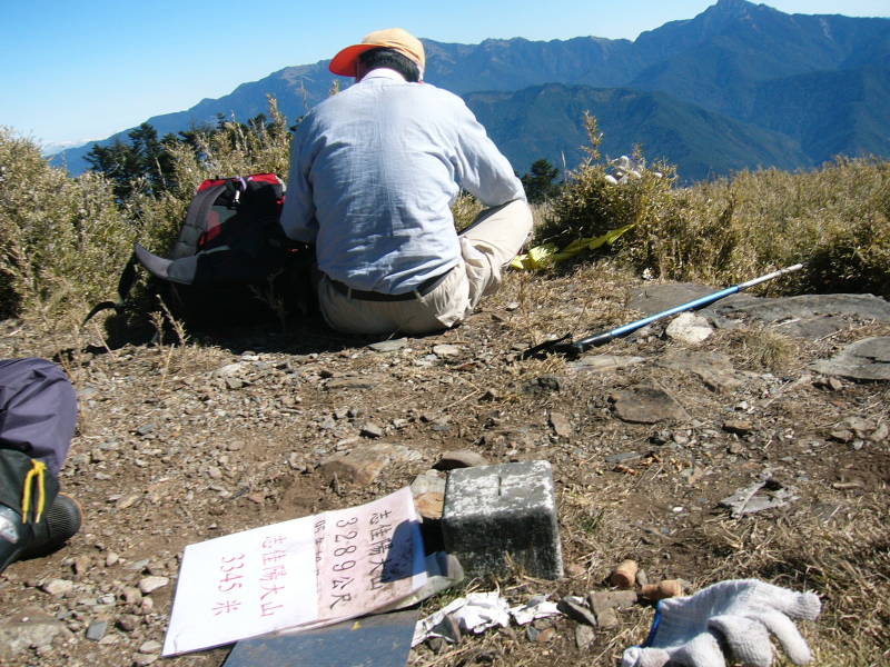 12:13~13:05 前方山頭遠望近在呎尺,無奈雙腳不聽使喚,每走10公尺,就休息一次,一路上氣喘如牛,好不容易終於到達基點峰,志佳陽大山 三等三角點 6303號 H3289m。此時晴空萬里幾近360度的展望,北一段連北二段、畢祿山、奇萊連峰、合歡群峰、雪山西稜、西南稜等盡收眼底。原路折回。