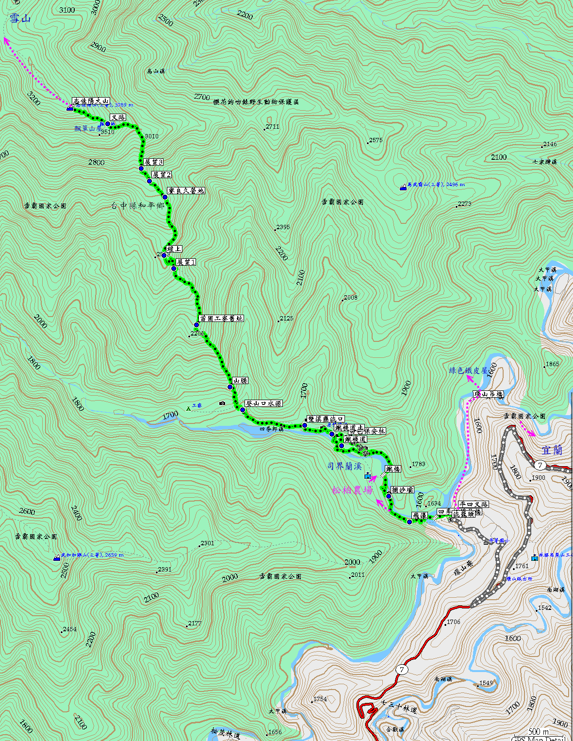 志佳陽大山 H3345m,其基點峰 H3289m,位於其東南稜上。目前雪霸國家公園尚未開放,要去的山友請自行斟酌,全境路況尚稱良好,沒有什麼危險地形。從最低點四季蘭溪吊橋上到基點峰,落差超過1700多公尺,除前段四季蘭溪吊橋到第一登山口指標牌較為平緩外,幾乎是一路直陡而上,讓人走的上氣不接下氣,直呼以後麥各來啊!