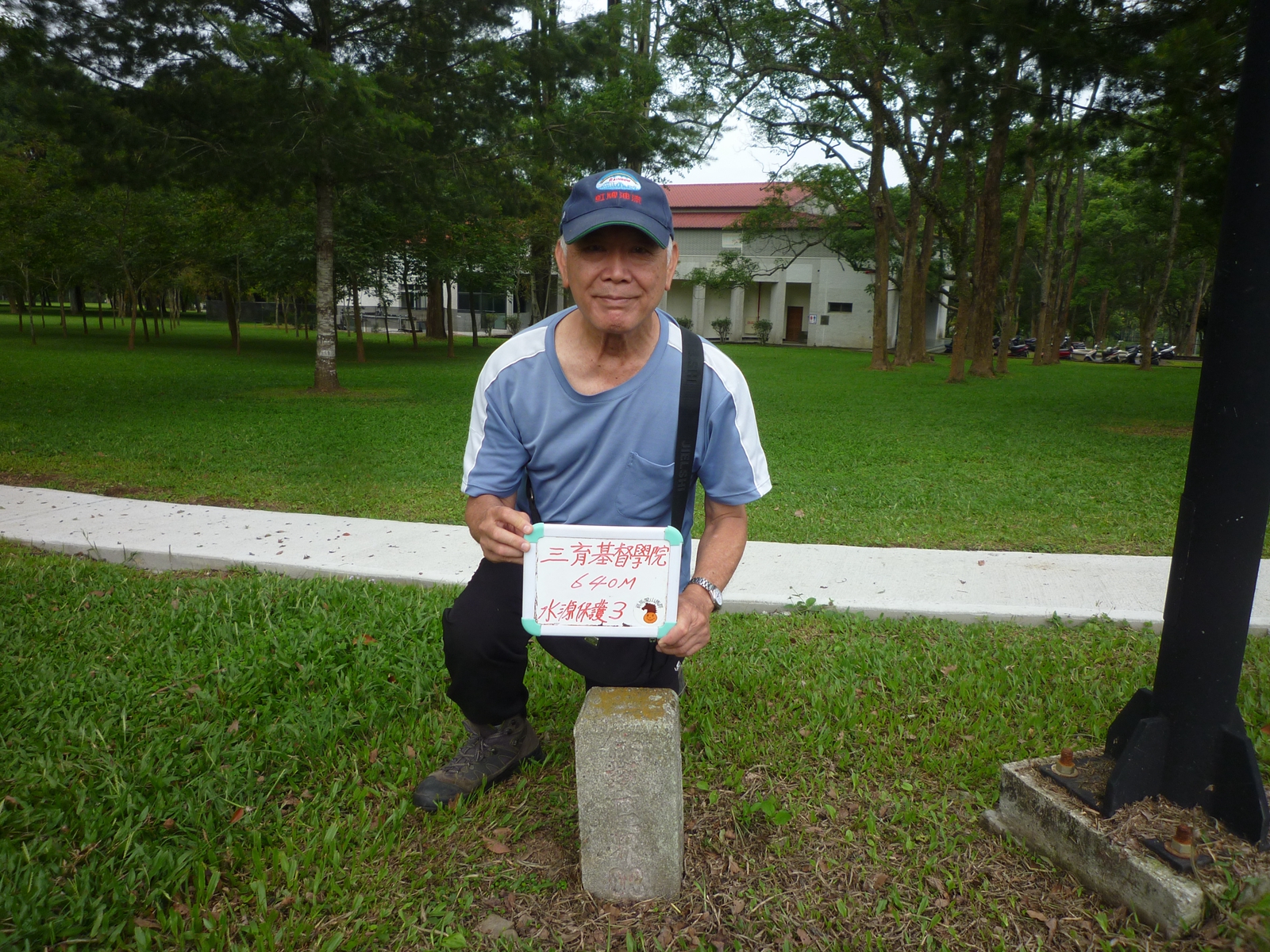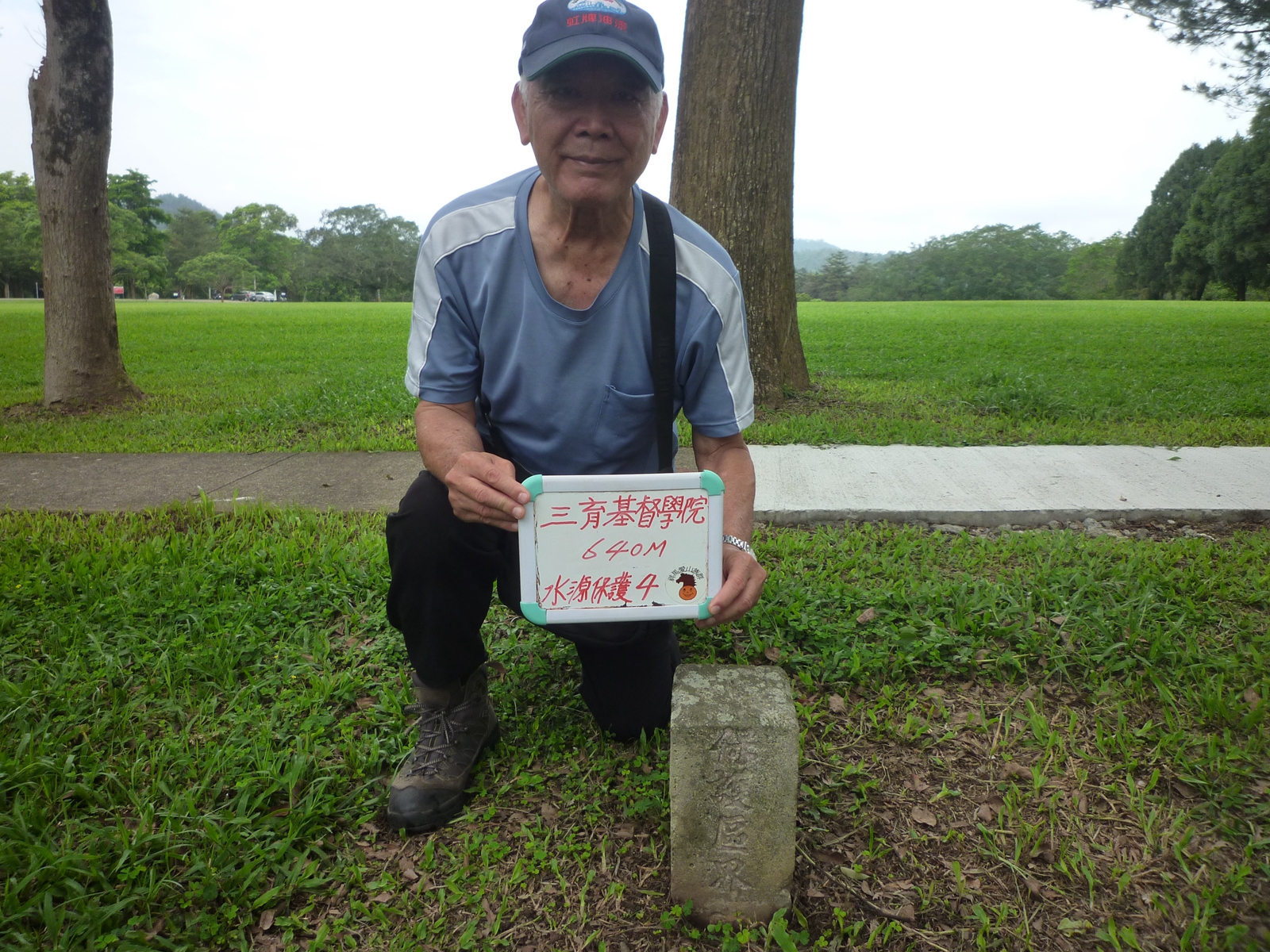 3三育基督學院(標高640M,魚池鄉水源保護區界03號基石),座標:242652.2644963,距大門約225公尺路左草坪上