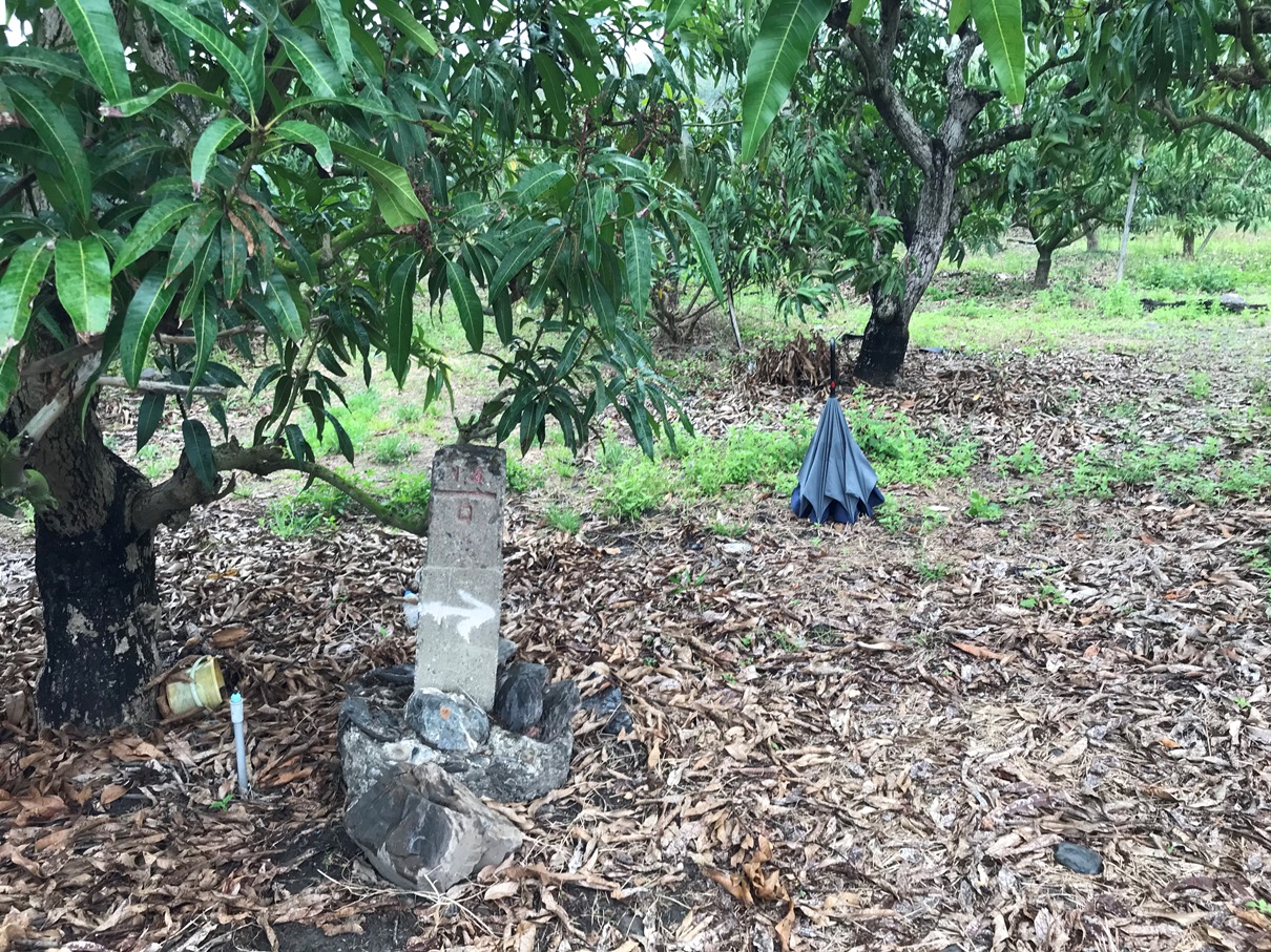 可能是在修築水泥路時,將它整個挖開移到果園內暫時放置,所以才會看到裸露的水泥基座及基石。
