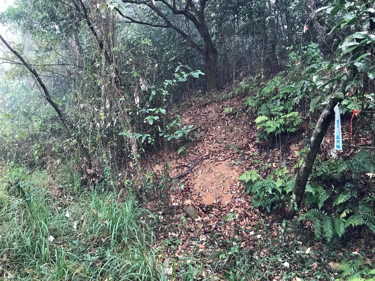 右轉沿小路向西南方走,不久到小路底接小徑繼續向西南方走,緩上走約30公尺到果園的南側,然後左轉沿稜線向東南方陡上,