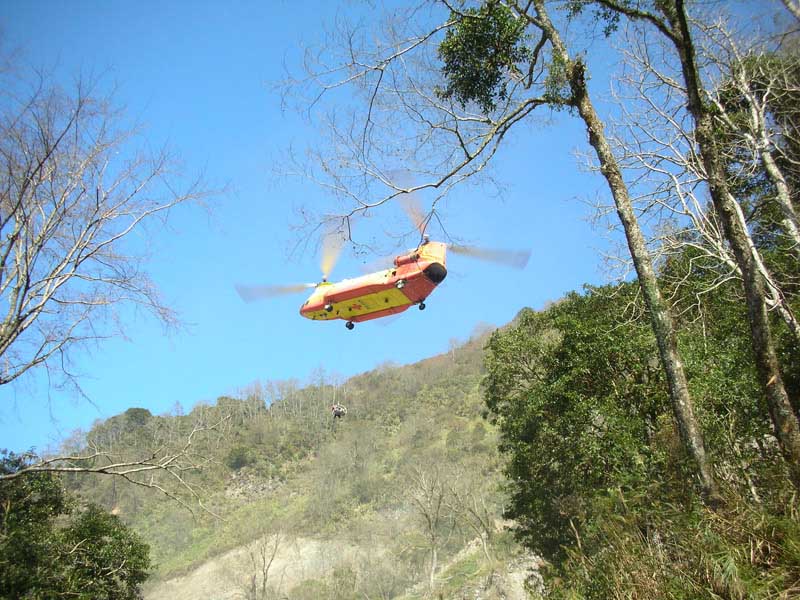 09:53直昇機將受傷人員王慶義吊掛接駁上機,初步檢查生命跡象穩定.直飛台南機場. 並將傷患送醫.(事後得知筋骨斷了三根)。